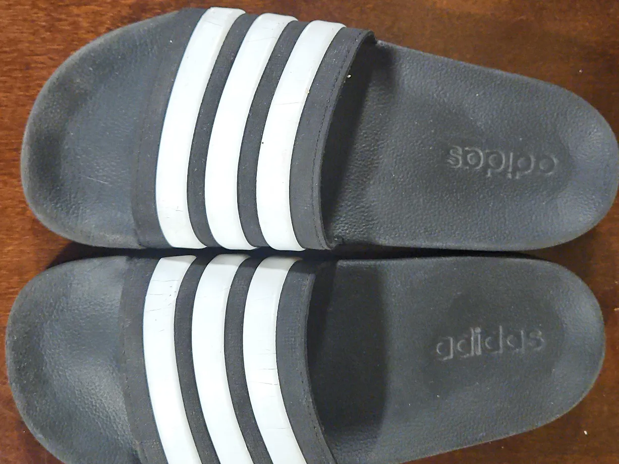 Selling a pair of Adidas Adilette slides in size US 7. They're in gently used condition, perfect for slipping on after a workout or just lounging around. The classic three-stripe design is always in style!