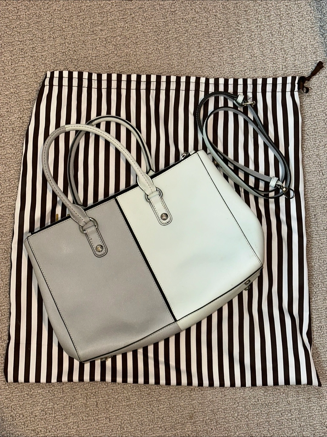 Selling a Henri Bendel satchel in a lovely two-tone design! It features a mix of grey and white leather. Comes with its original dust bag for safekeeping.