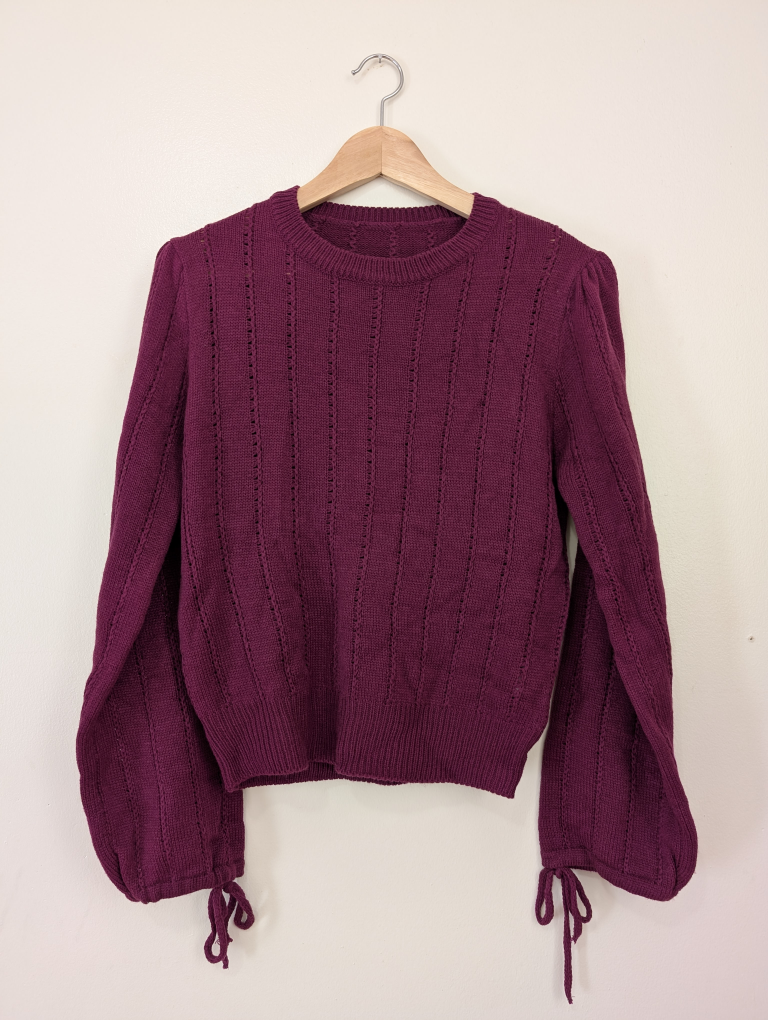 A cute purple long sleeve knit sweater! It's in great condition and ready for a new home. The sweater features a classic crew neck and stylish tie detailing on the sleeves. Perfect for layering or wearing on its own during cooler days.
