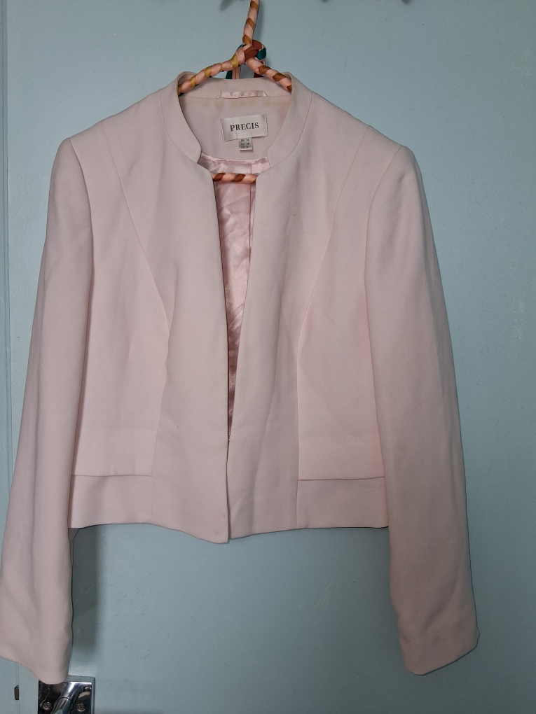 Selling a cute Precis blazer in a lovely pink colour. It's a size 8. There are some stains on the collar, as pictured. Dry cleaning will make it as new