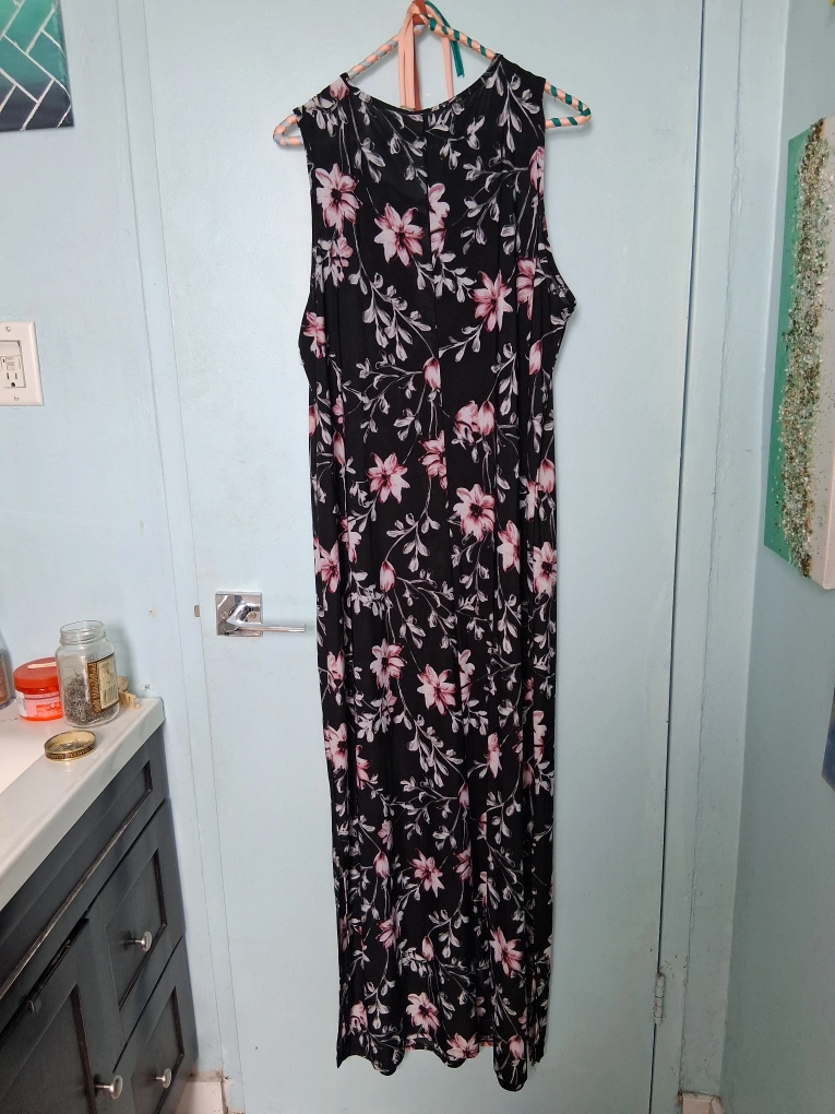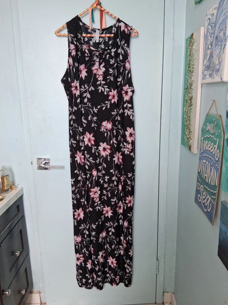 This is a lovely floral maxi dress from Dress Barn! It's a size 2X and features a pretty floral pattern on a black background. Perfect for summer days or evenings out. Never been worn.
