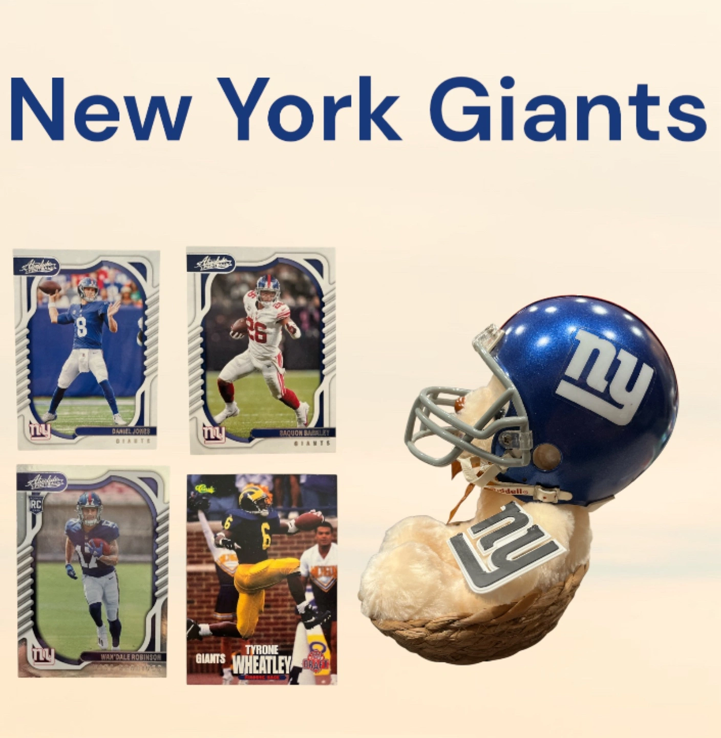 Adorable New York Giants teddy bear wearing a helmet and with some Trading Cards. Perfect for any Giants fan or collector.