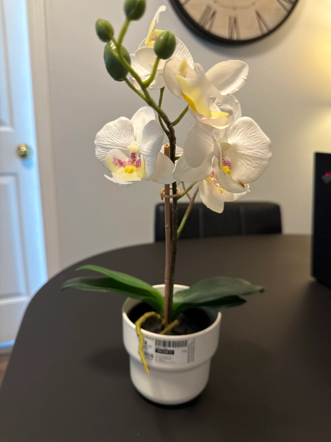 Selling a lovely artificial potted orchid from IKEA. It's the FÖRENLIG model and adds a touch of greenery to any space without the need for watering. The pot is white and the orchid features delicate white flowers. It's in great condition and ready to brighten up your home!