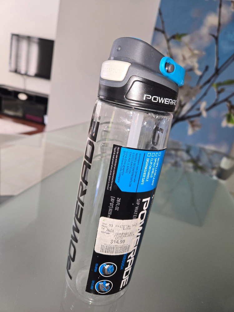 Selling a Powerade water bottle, perfect for staying hydrated during workouts or on the go! It holds 28 fl oz (828ml) and features a convenient sip water design. The bottle has a clip-on handle and a spout shield to prevent spills and leaks. It's also dishwasher safe for easy cleaning