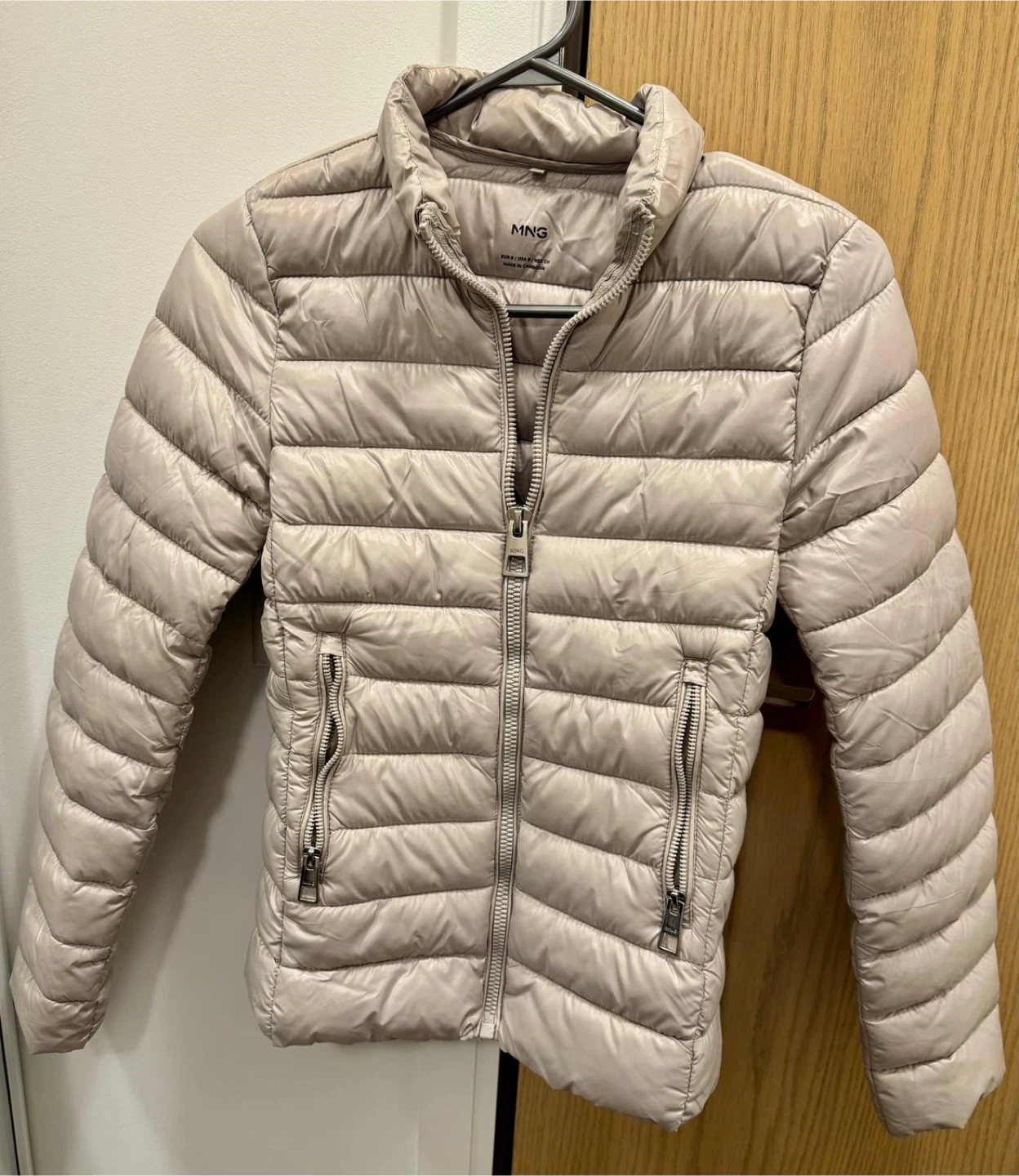 MNG puffer jacket in a light beige colour. It features a full zip closure and two zippered side pockets. Made in Cambodia. Size “Small”