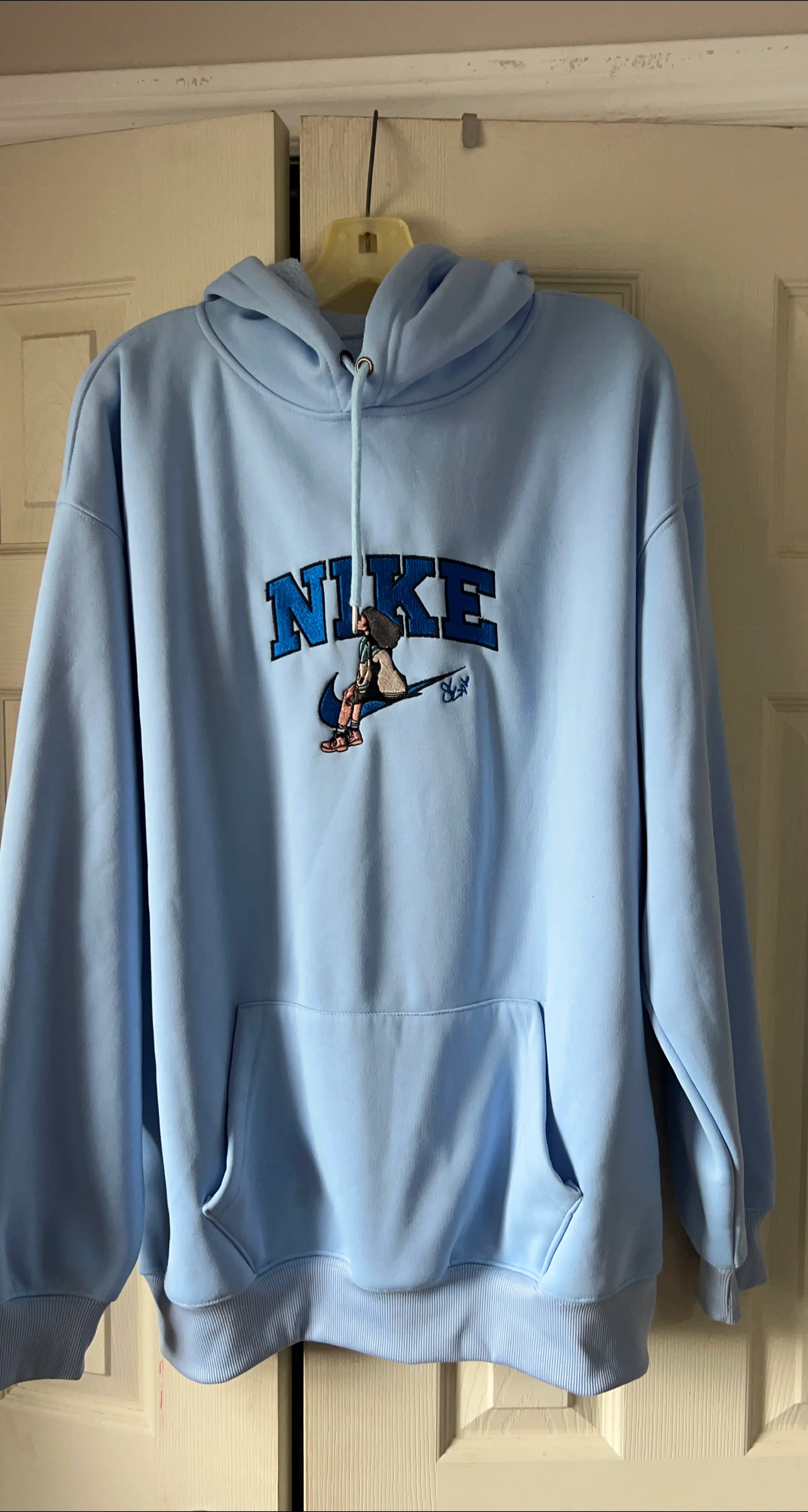 Here's a comfy Nike hoodie in a lovely light blue colour. It features a unique design on the front. It's in great shape and ready for a new home!