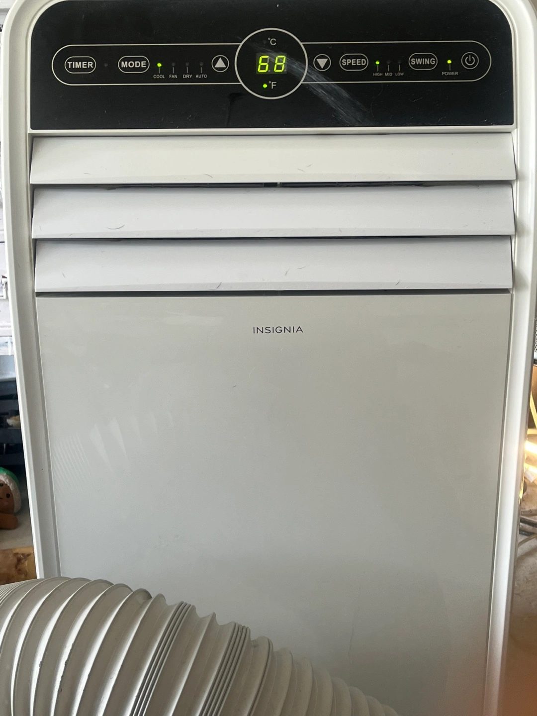 Selling an Insignia portable air conditioner. It features cool, fan, dry, and auto modes, with adjustable speed and swing settings. Perfect for keeping your space cool and comfortable! Comes with hose extension 10000 btu