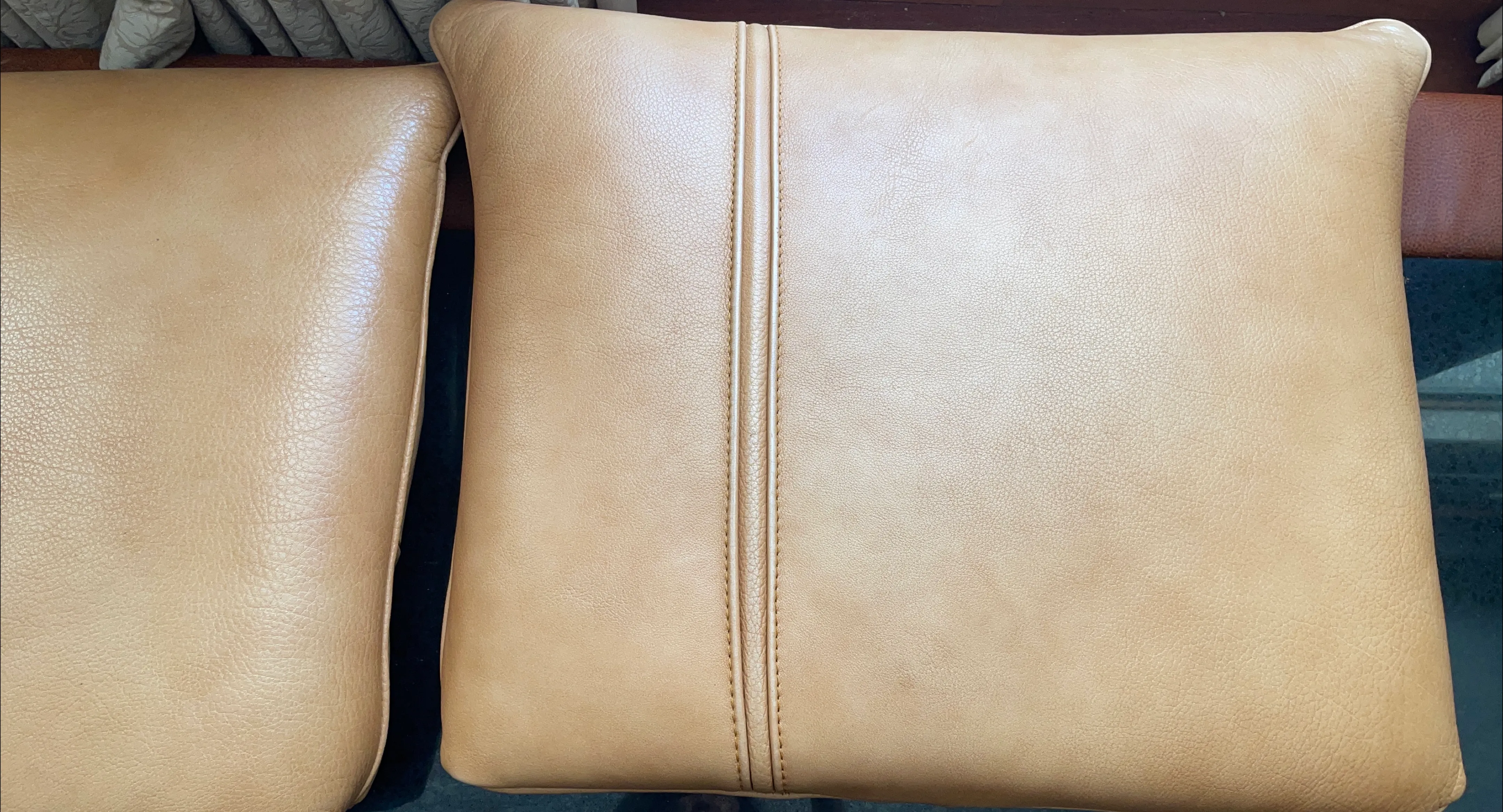Selling a tan leather pillow. It's in good condition and would look great on a couch or chair. Perfect for adding a touch of warmth and texture to your living space!