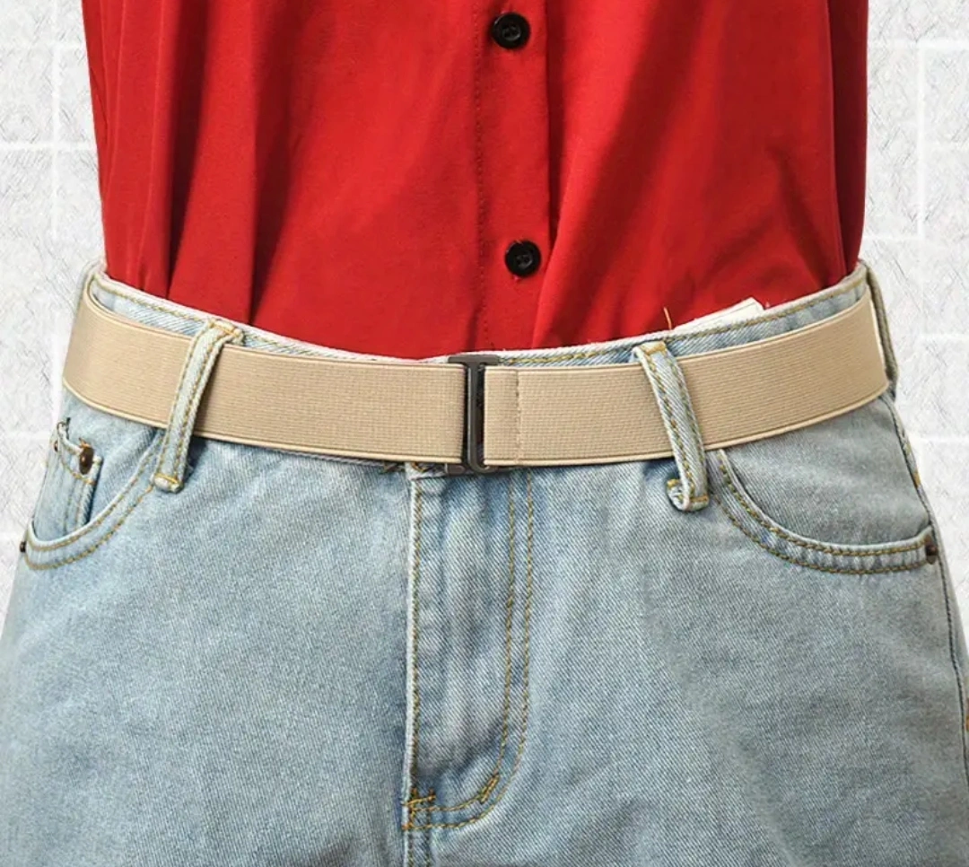 This is an adjustable slim fit elastic invisible waist belt for women. It's a stretchy traceless jeans belt with a metal buckle.