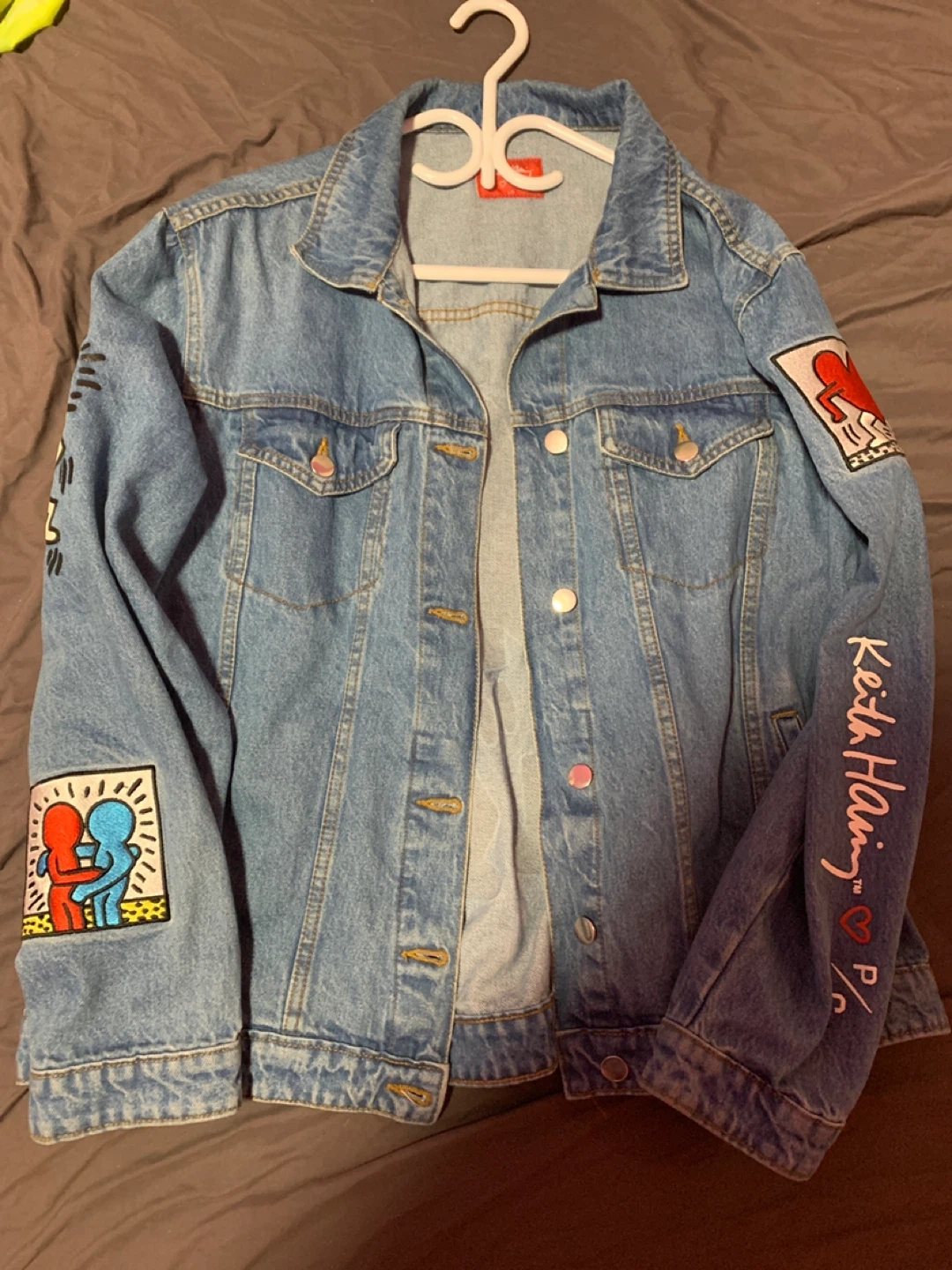 Selling a stylish Keith Haring denim jacket! It features iconic designs and is in great condition. A unique piece to add to your wardrobe!