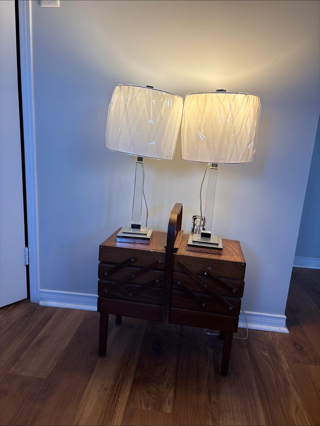 Purchased a year ago, like new with cellophane still on the shades. Crystal stems. Elegant additions to any room. Purchased at Home Sense for $70 each. A steal!