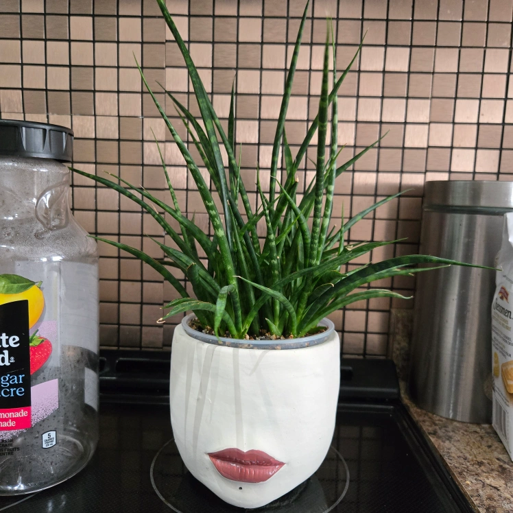A unique face planter pot with a healthy snake plant. This eye-catching piece adds a touch of modern art to any space, perfect for plant lovers!