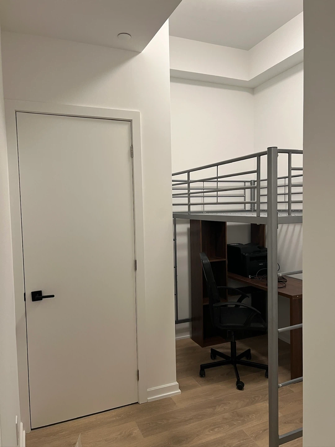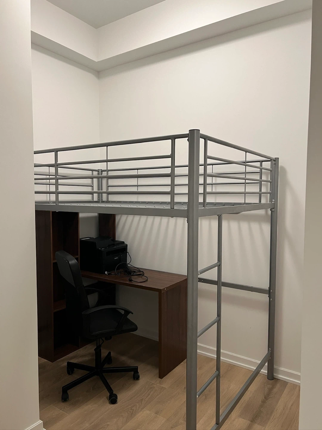 Selling a silver metal loft bed frame (TWIN size), perfect for maximizing space in a smaller room. The frame is sturdy and in good condition. Mattress is not included. It is sold separately for $200. I got it from the Brick for $349 + tax Ready for pick up!