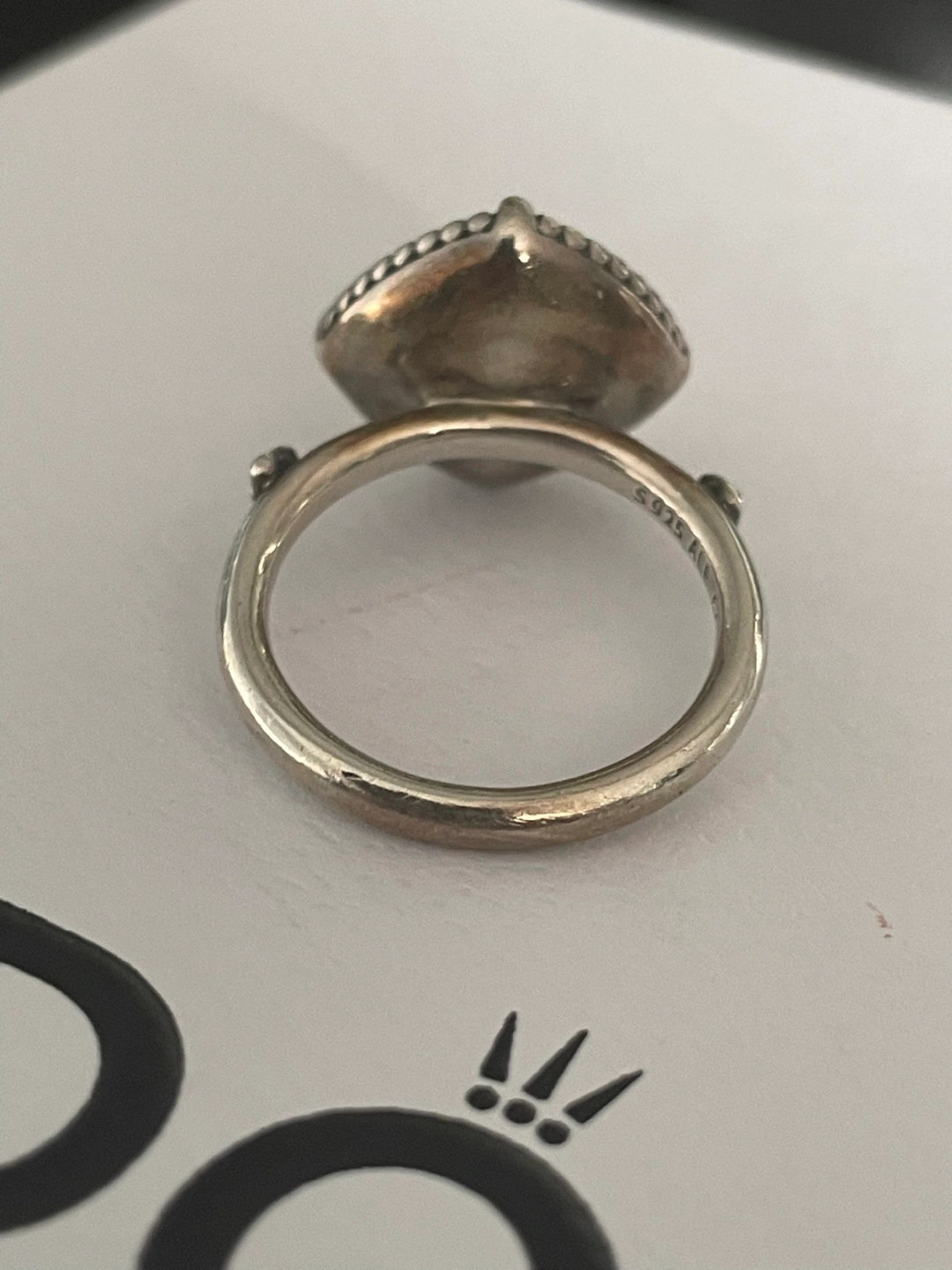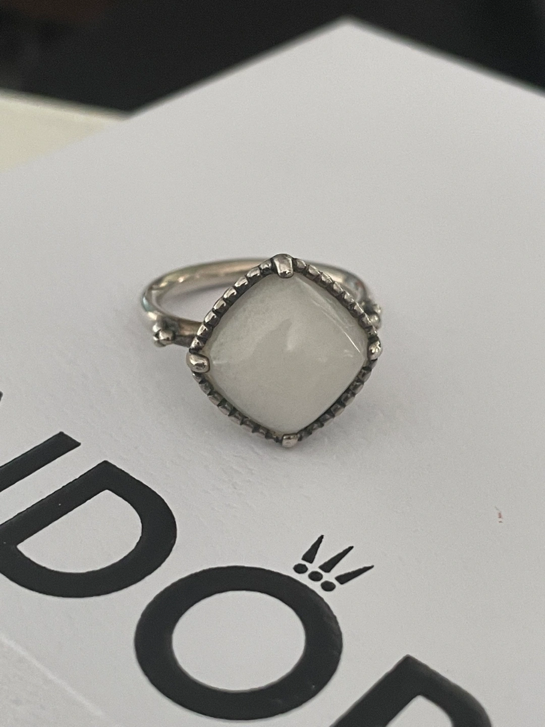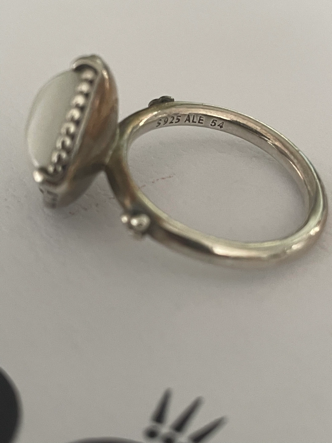 35Selling a lovely Pandora ring! It's a silver ring featuring a white, square-cut stone. The ring is marked with 'S925 ALE 54', indicating it's made of sterling silver and is a size 54.