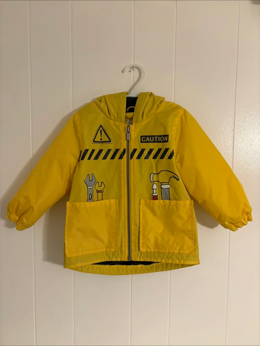 Fleece lined wind breaker/rain jacket. Construction themed. Carters. Sized 18 months. Located Broadview and Mortimer. East York. Porch pick up.