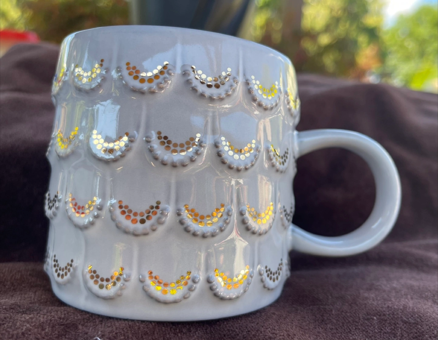 Selling a Starbucks Anniversary mug featuring a mermaid siren tail scales design. It's a lovely gray and gold colour, and holds 10 fl oz (296 ml). Please note that it's hand wash only and not microwave safe