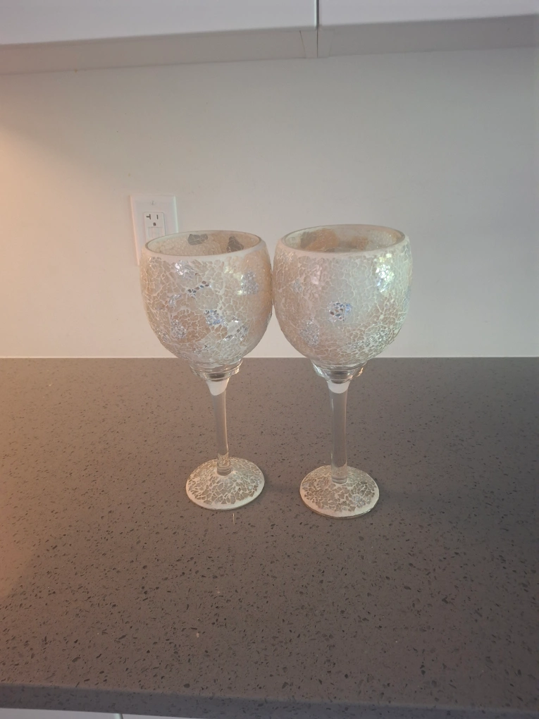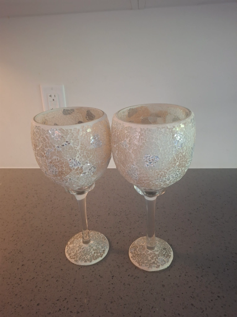 Selling a pair of lovely mosaic candle holders. They have a beautiful, textured design that catches the light nicely. Perfect for adding a touch of elegance to your next dinner party or just enjoying a quiet evening at home