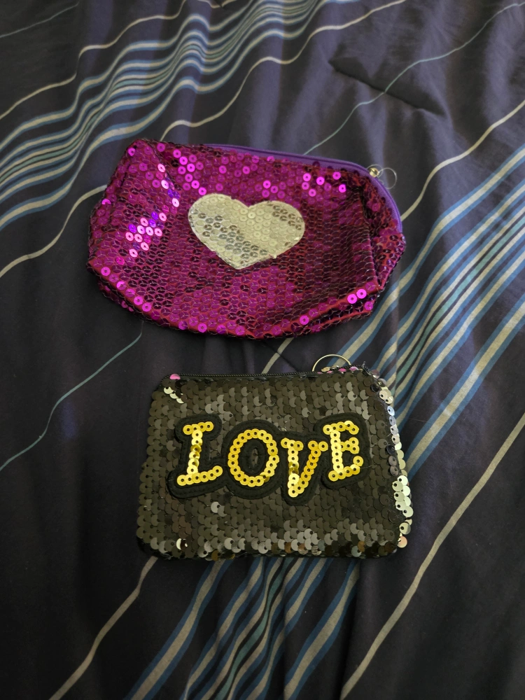 Two cute sequin coin purses! One is purple with a silver heart, and the other is black with the word 'LOVE' in gold lettering. Perfect for carrying small items or as a fun accessory