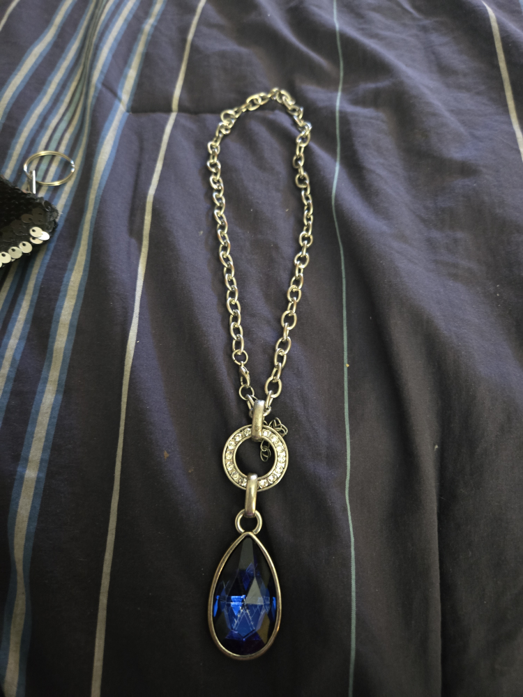 This is a lovely necklace with a silver chain and a striking blue teardrop pendant. The pendant features a circular design with small rhinestones above the teardrop, adding a touch of sparkle. It's in great condition and ready to add a pop of colour to any outfit