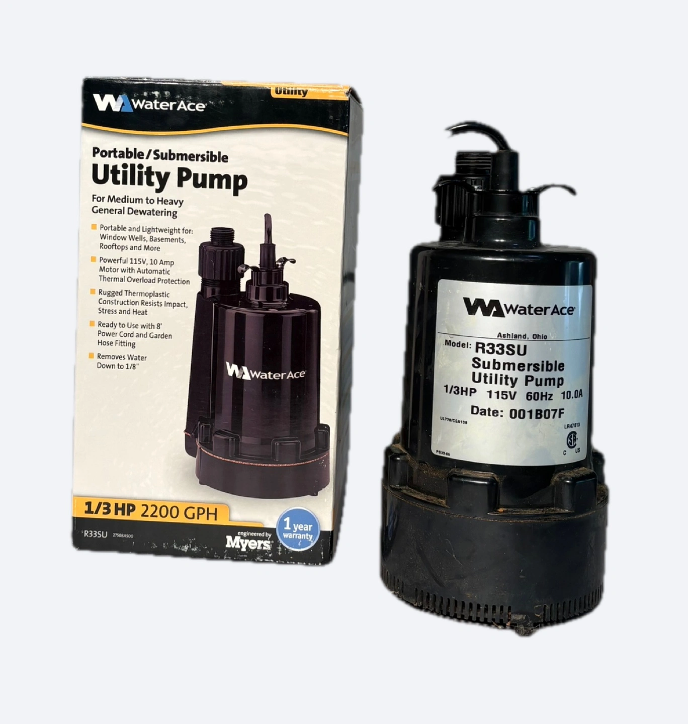 Selling a Water Ace R33SU portable and submersible utility pump in good condition! It's perfect for basements and for medium to heavy general dewatering.