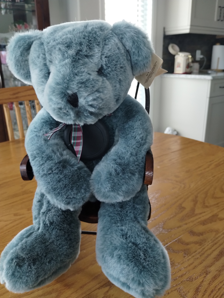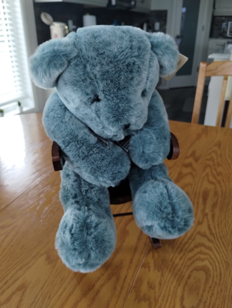 Here's a cuddlylight blue plush teddy bear looking for a new home! It's in great condition and ready to be displayed or played with. The bear features a cute plaid ribbon around its neck and is seated in a miniature wooden chair. It would make a lovely addition to any collection or a sweet gift!. $12. see other bears from my collection for sale.