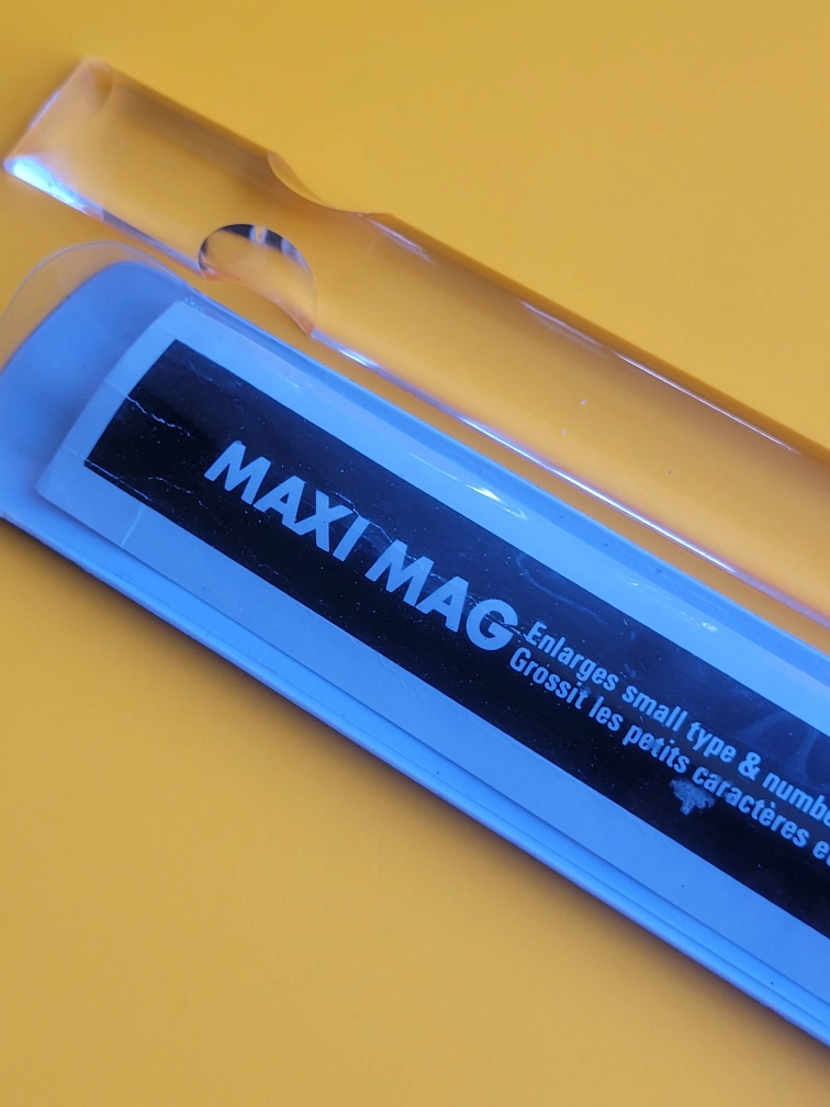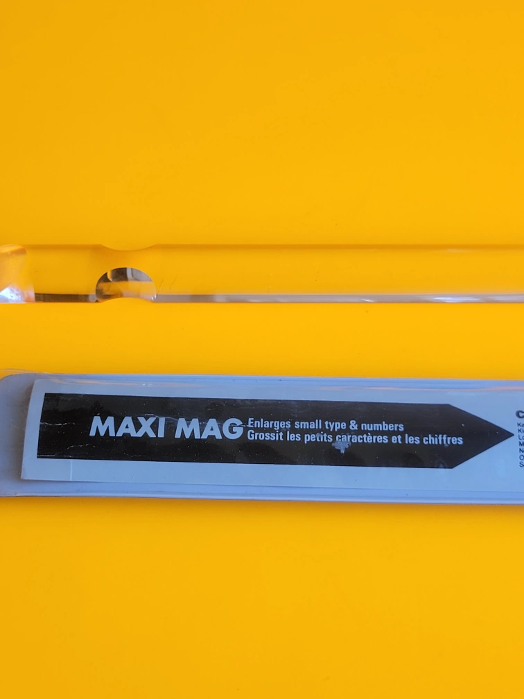 Maxi Mag magnifying glass, perfect for enlarging small print and numbers with ease. Its sleek design makes it easy to handle and carry. Makes a great gift for people who like to read! * Enlarges Small Type & Numbers Lay over top of the words or numbers while reading $20 Made by Horizon Imports Toronto. 10"long by 1" Cass included Fennell and Upper gage Hamilton Please see my many estate items