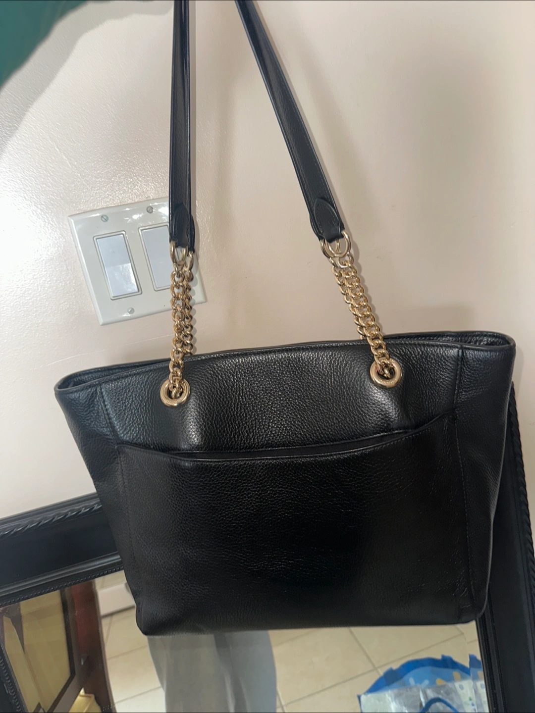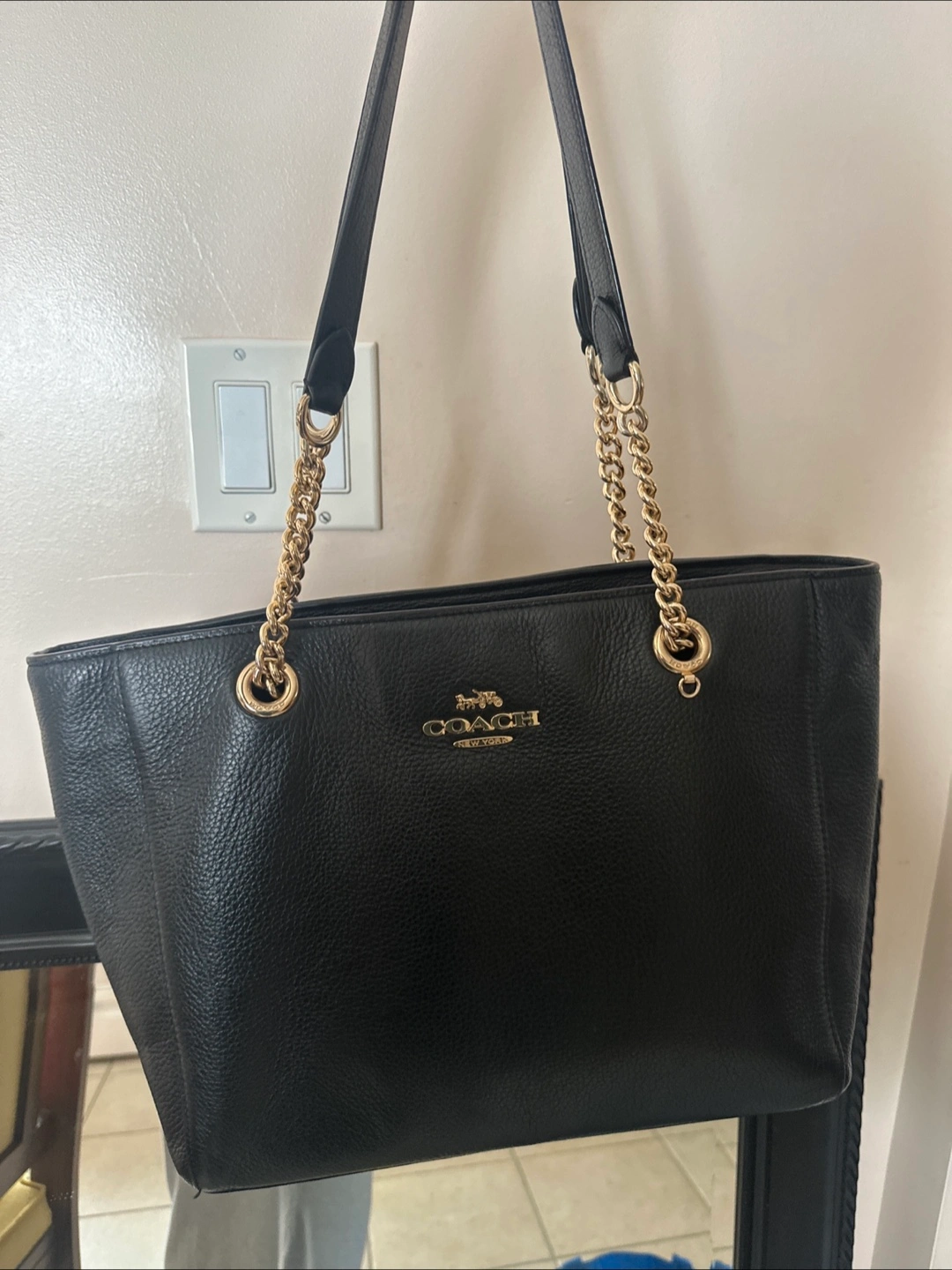 Selling a Coach black leather tote bag with chain detailing. It's in great condition and ready for a new home! The bag features a classic design with gold-tone hardware and a spacious interior. Perfect for everyday use or a night out