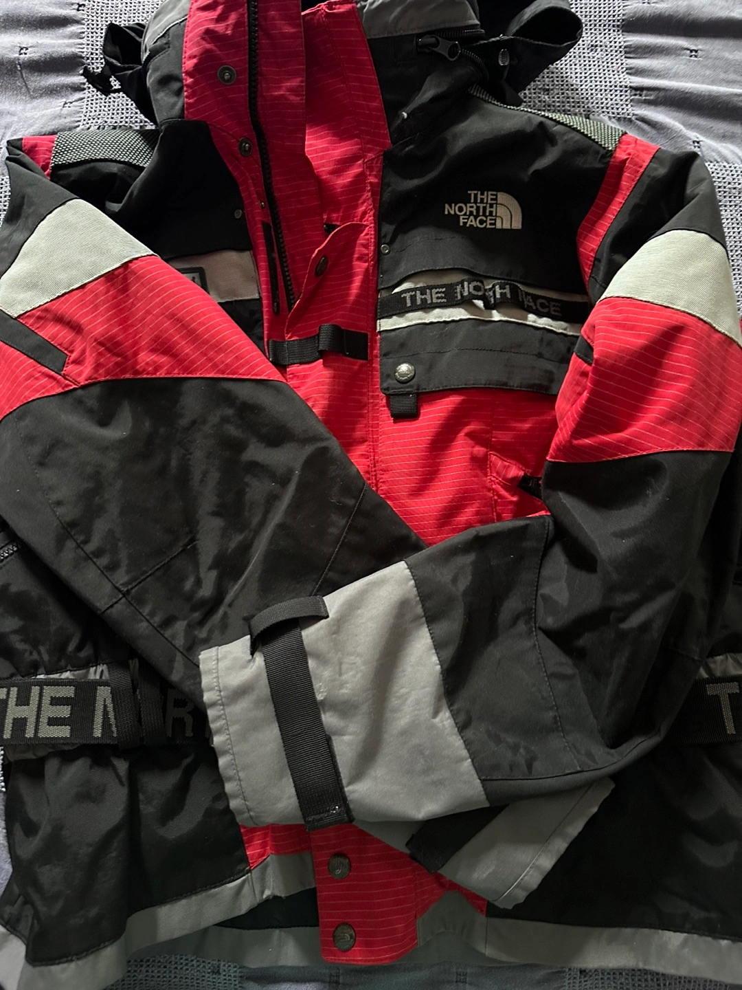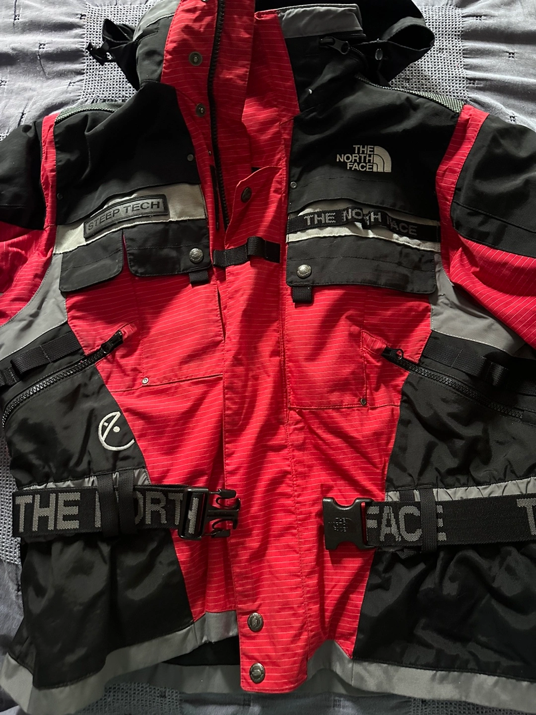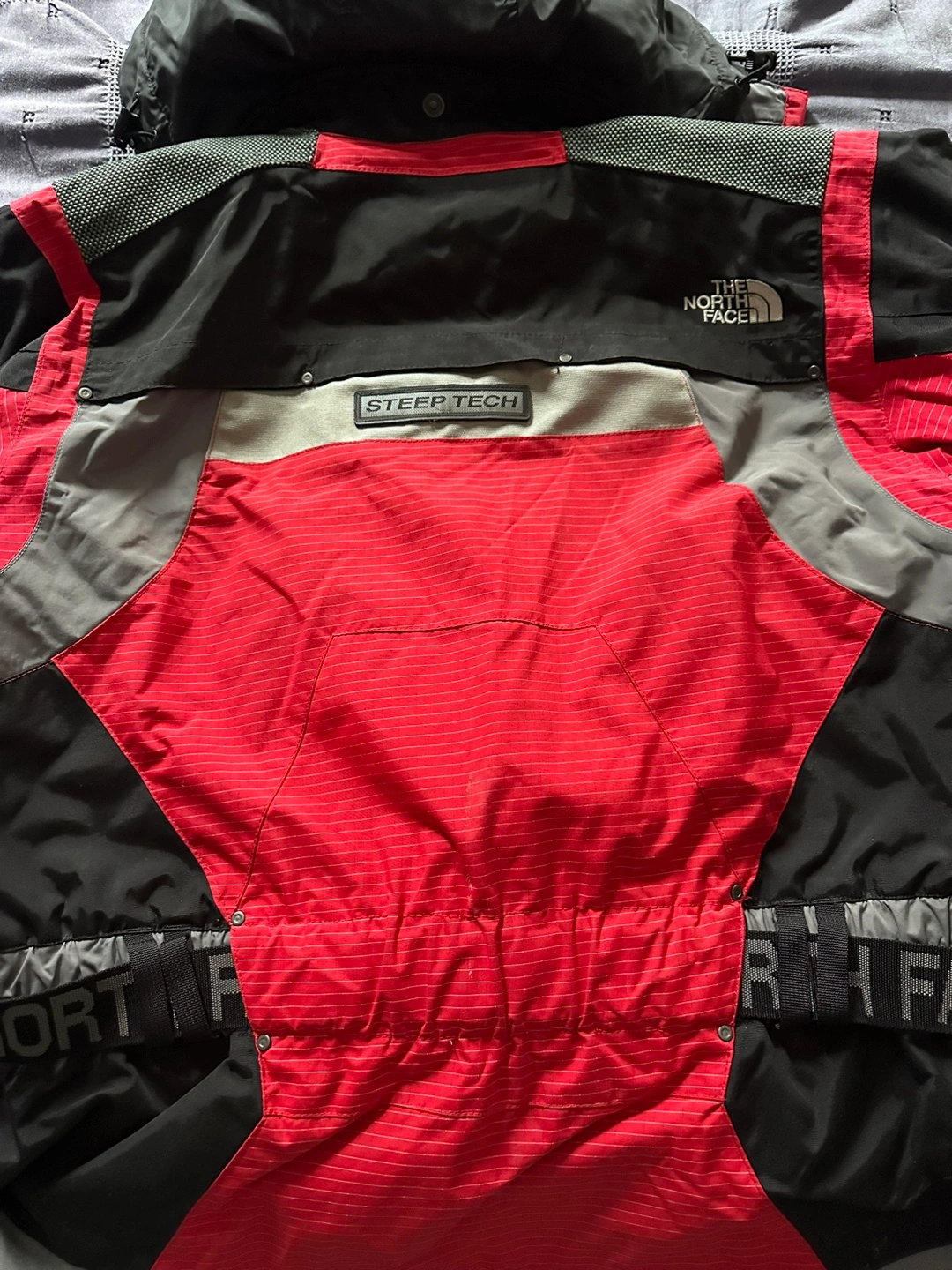 Selling a The North Face Steep Tech jacket in women's size XL. It's a stylish and functional jacket, perfect for outdoor activities or everyday wear. The jacket features a unique design with a combination of red, black, and gray colors. It has a Steep Tech logo and other details, making it a standout piece. Don't miss out on this great jacket!