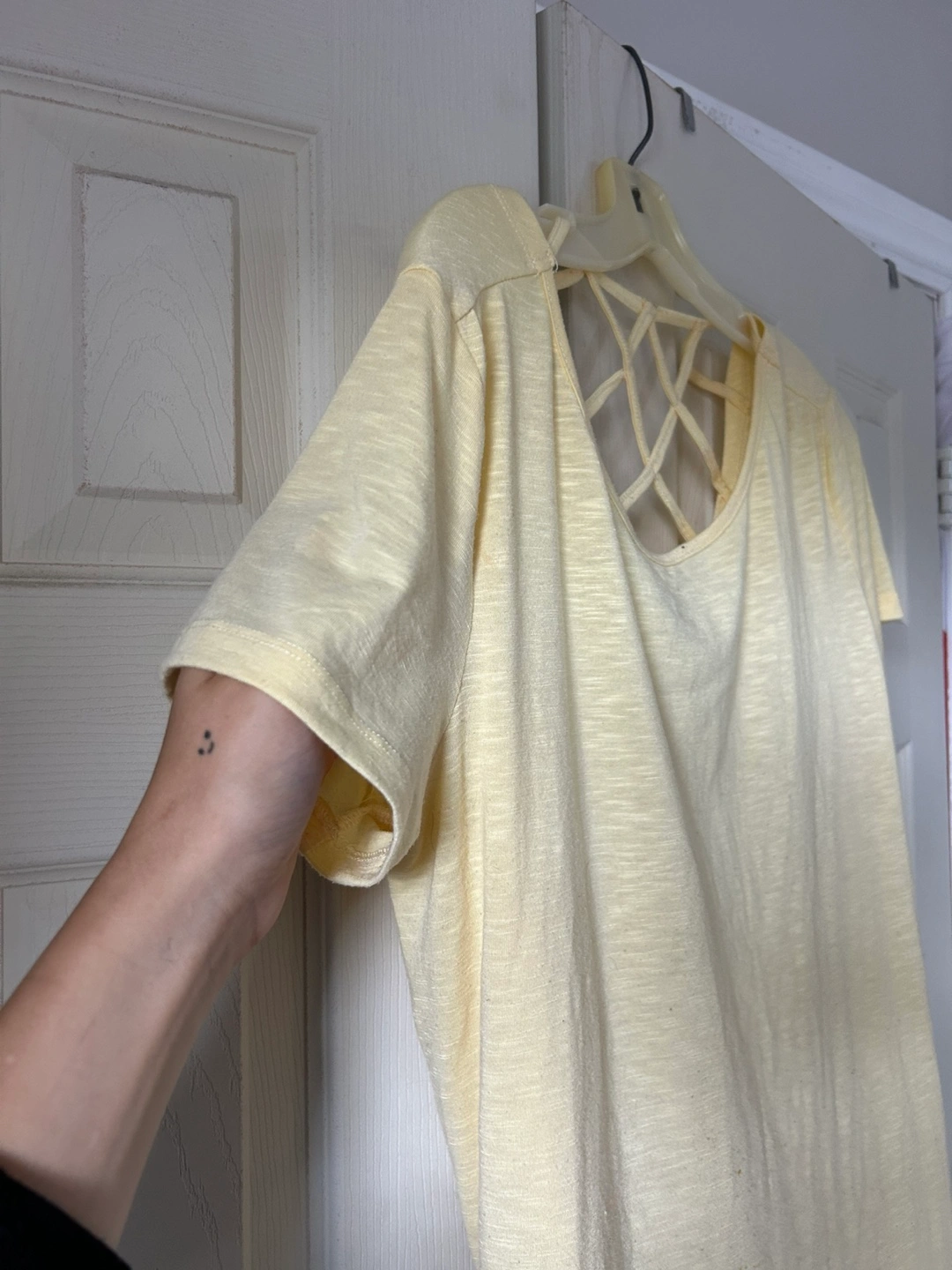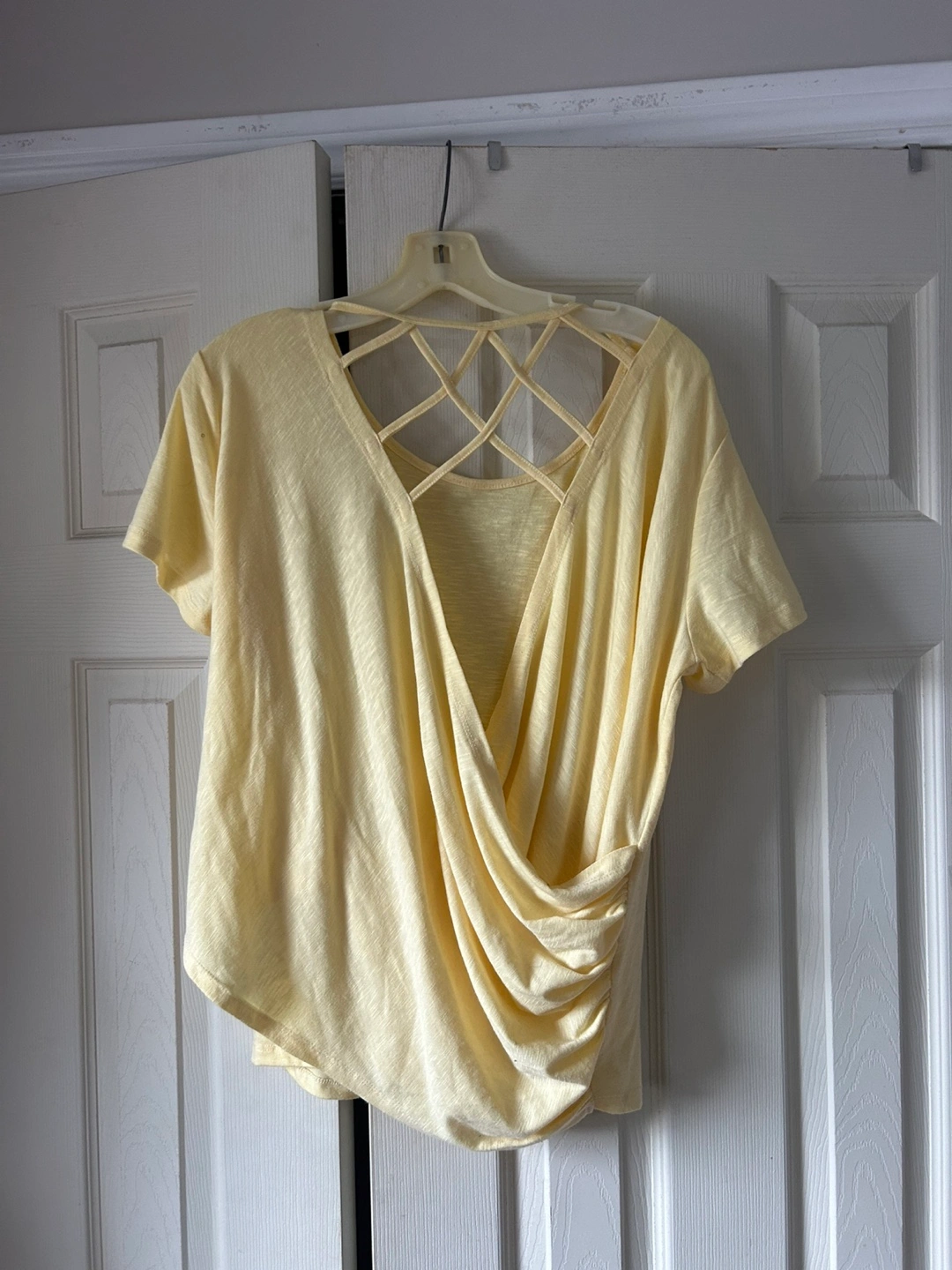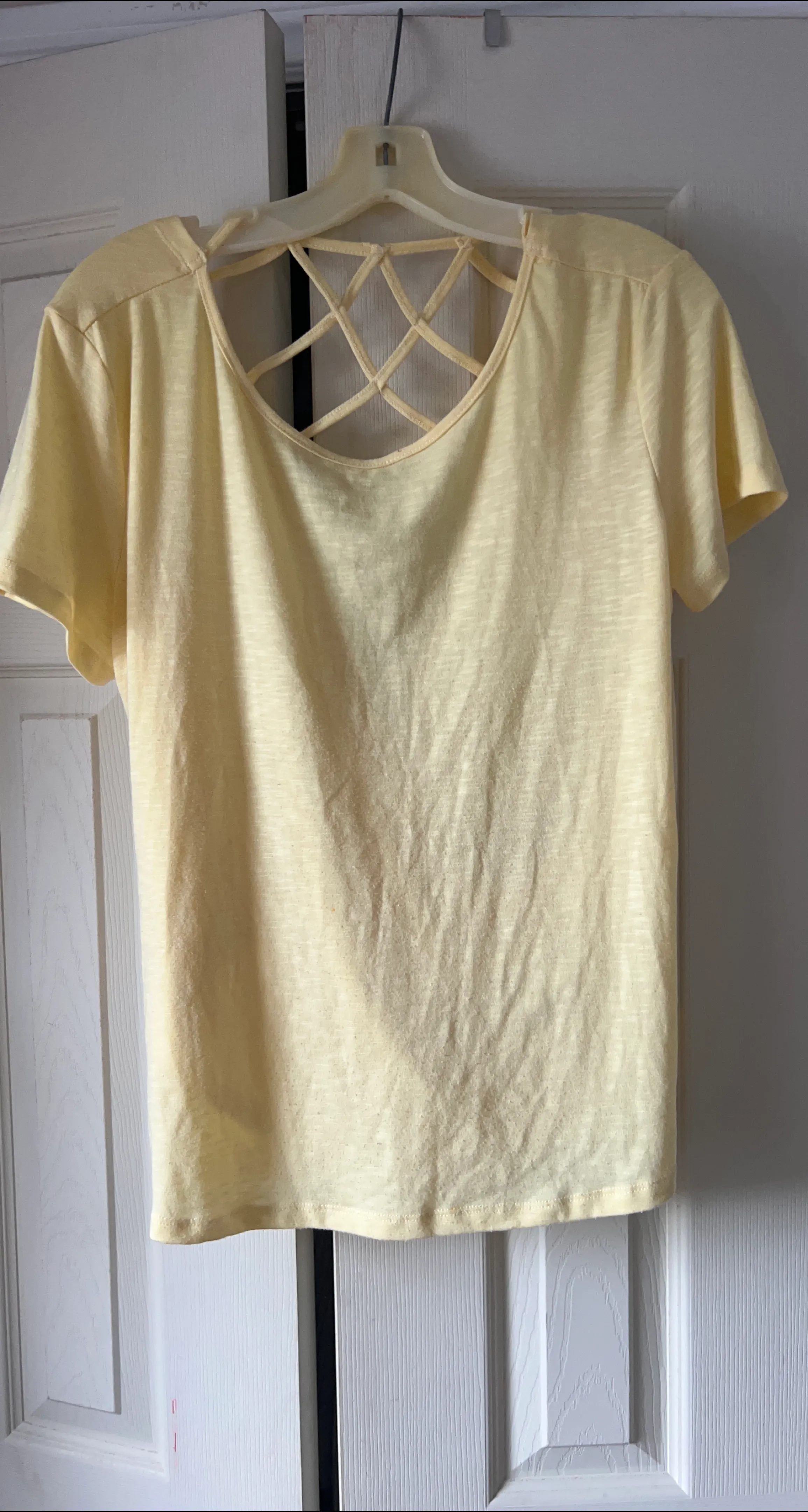 A cute yellow t-shirt with a unique criss-cross back design! It's in great condition and ready for a new home. Perfect for a casual day out or layering under a jacket. The light yellow colour is perfect for spring and summer