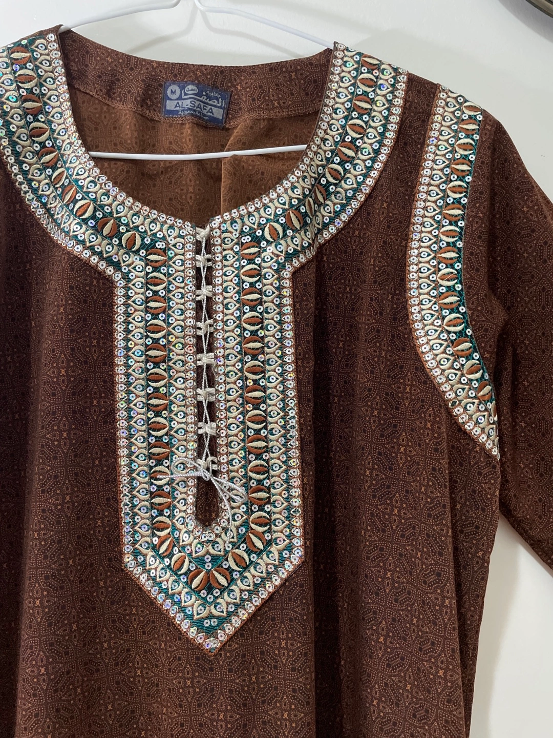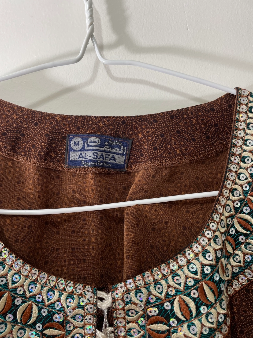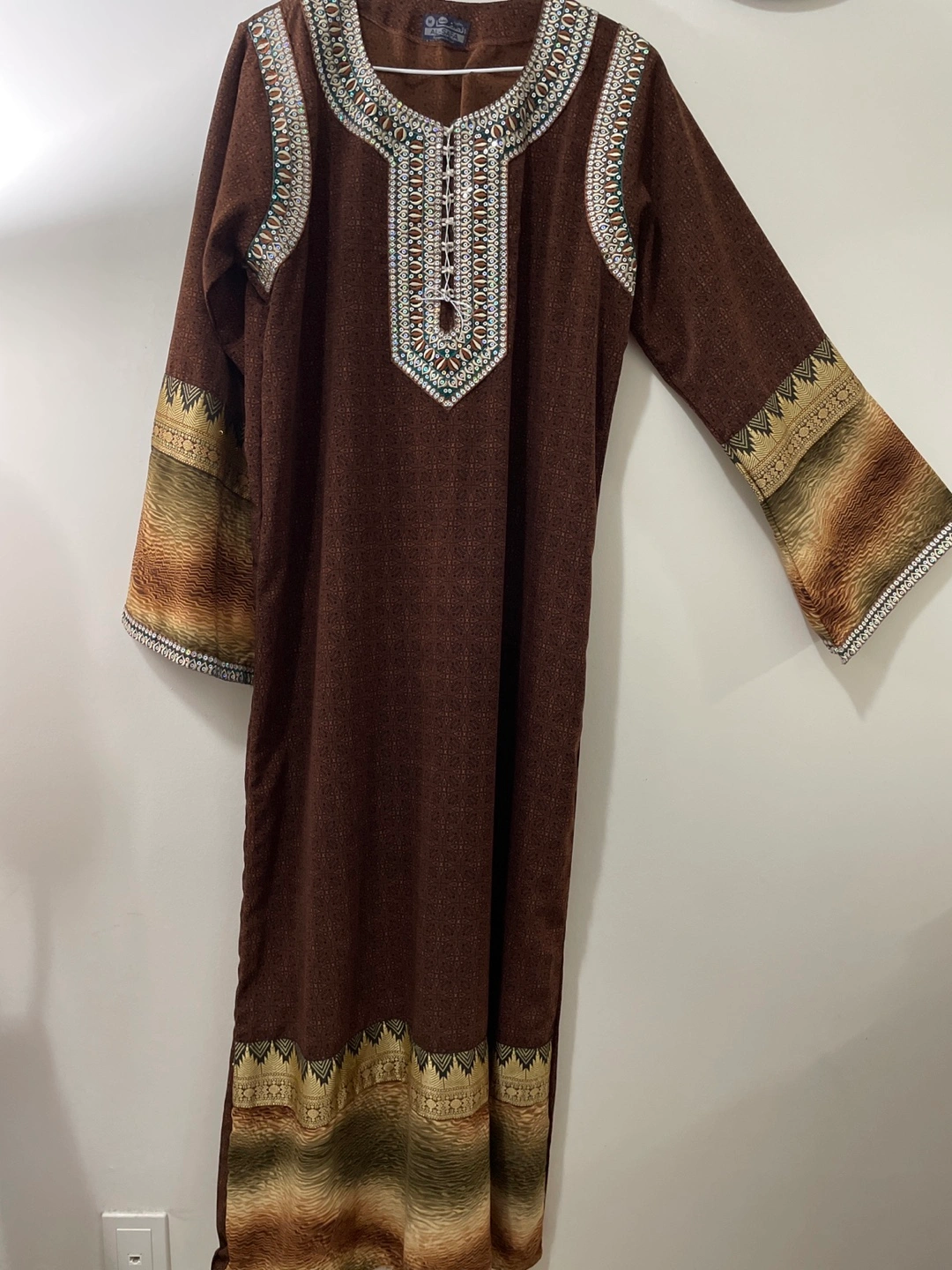 Beautiful brown dress , featuring lovely embellishments around the neckline and hem. It's a size M and in great condition. Perfect for a special occasion or to add some flair to your wardrobe! Like new I washed only one time