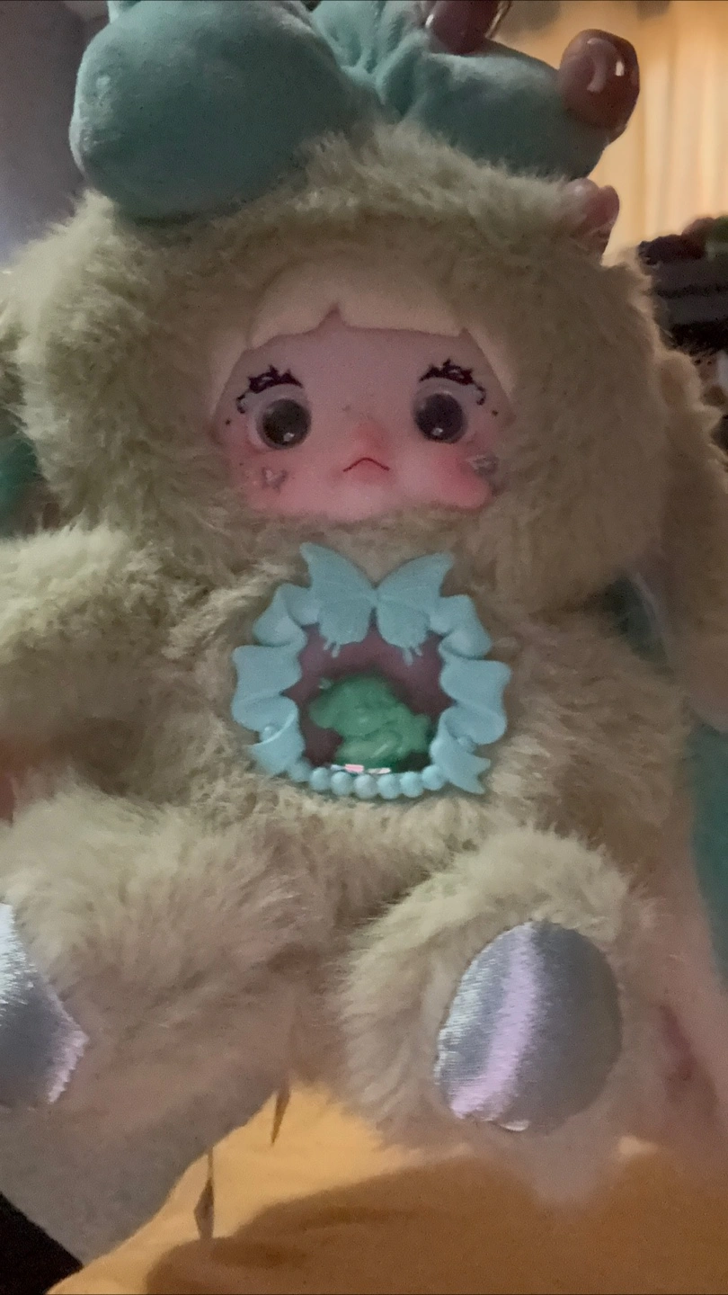 A cute plush doll toy with a furry, light green body and light blue accents. The doll features a unique design with a small opening in the chest area.