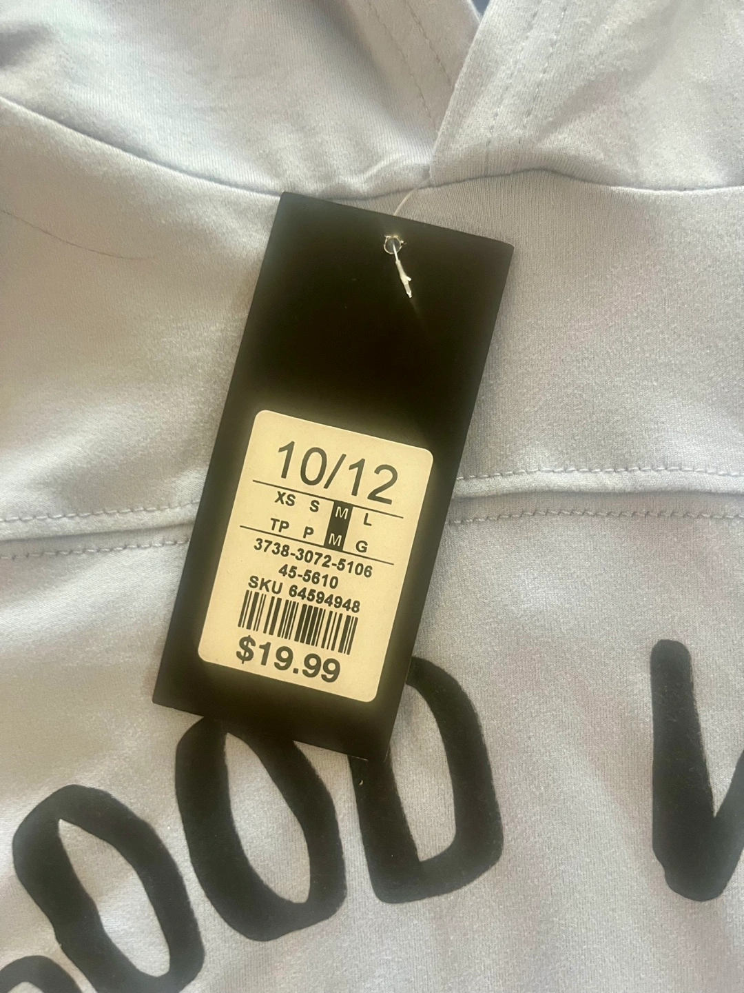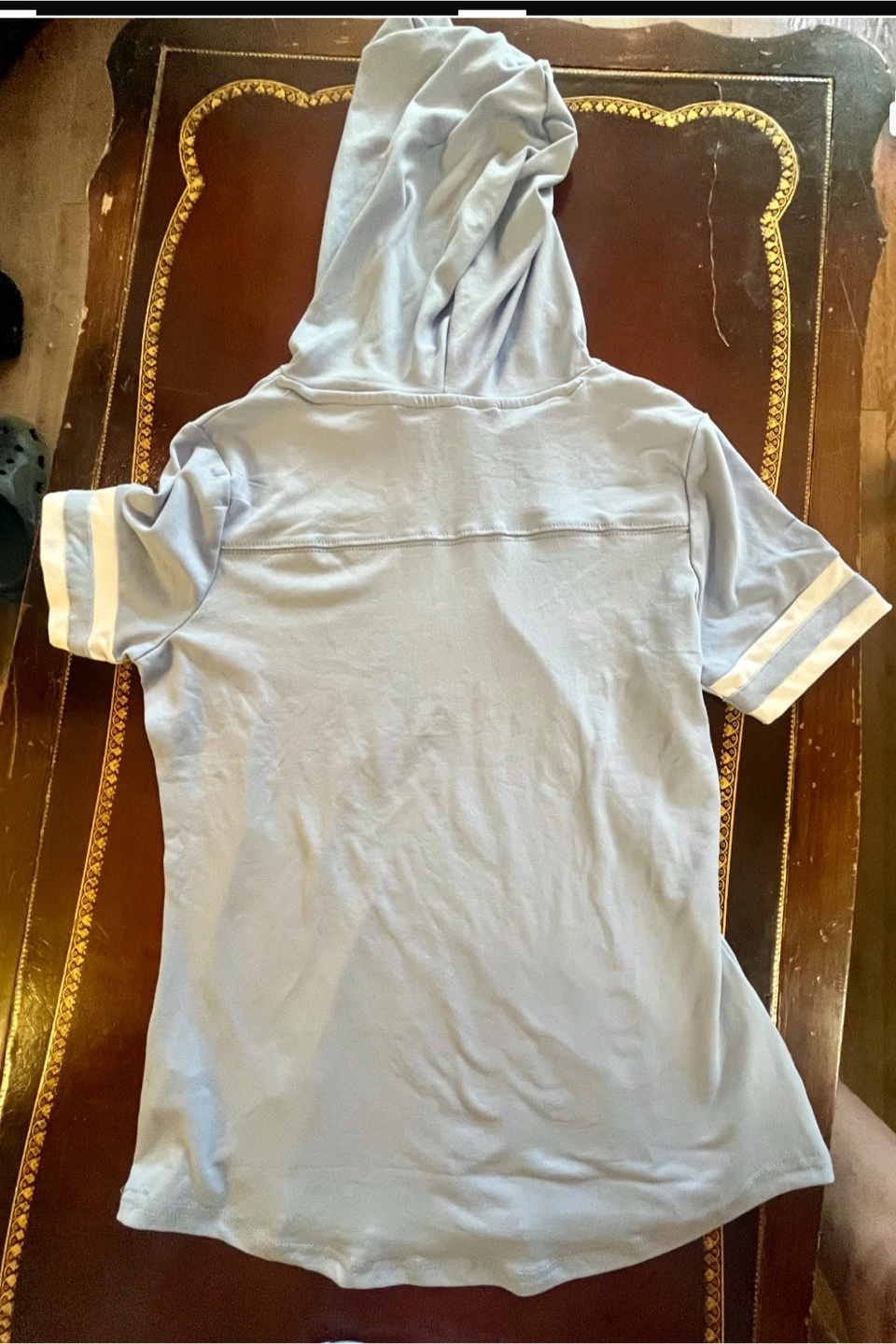The hoodie T-Shirt is a size 10/12 and the shorts sold separately are a size 7/8 so that the top is longer.