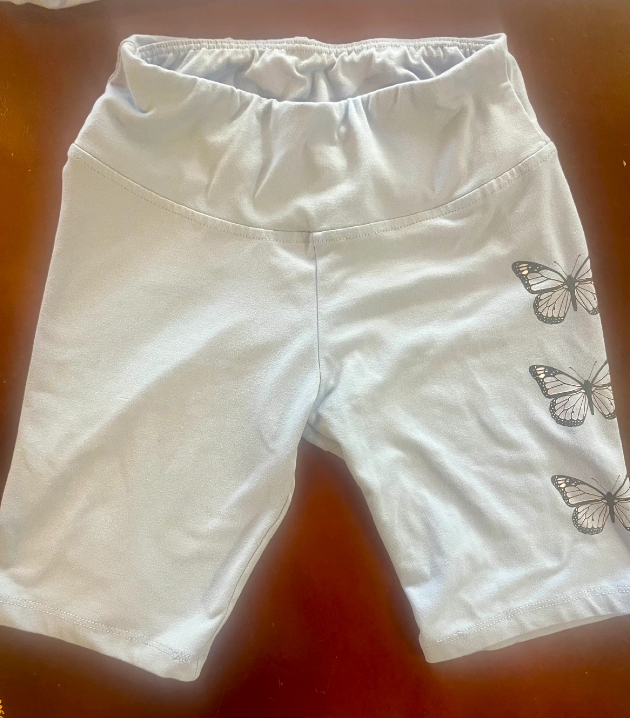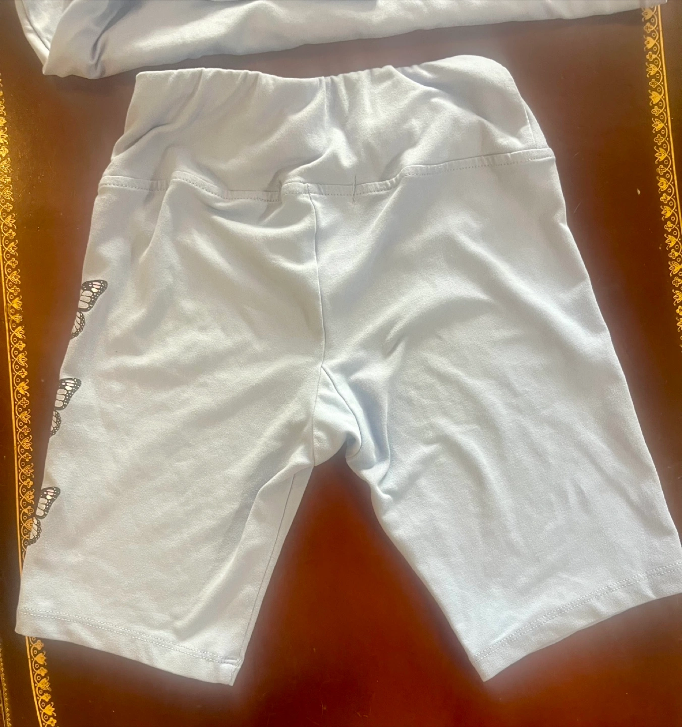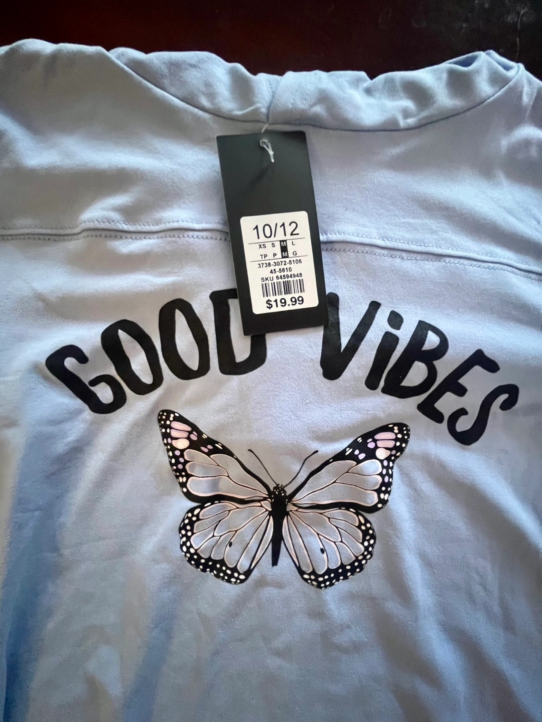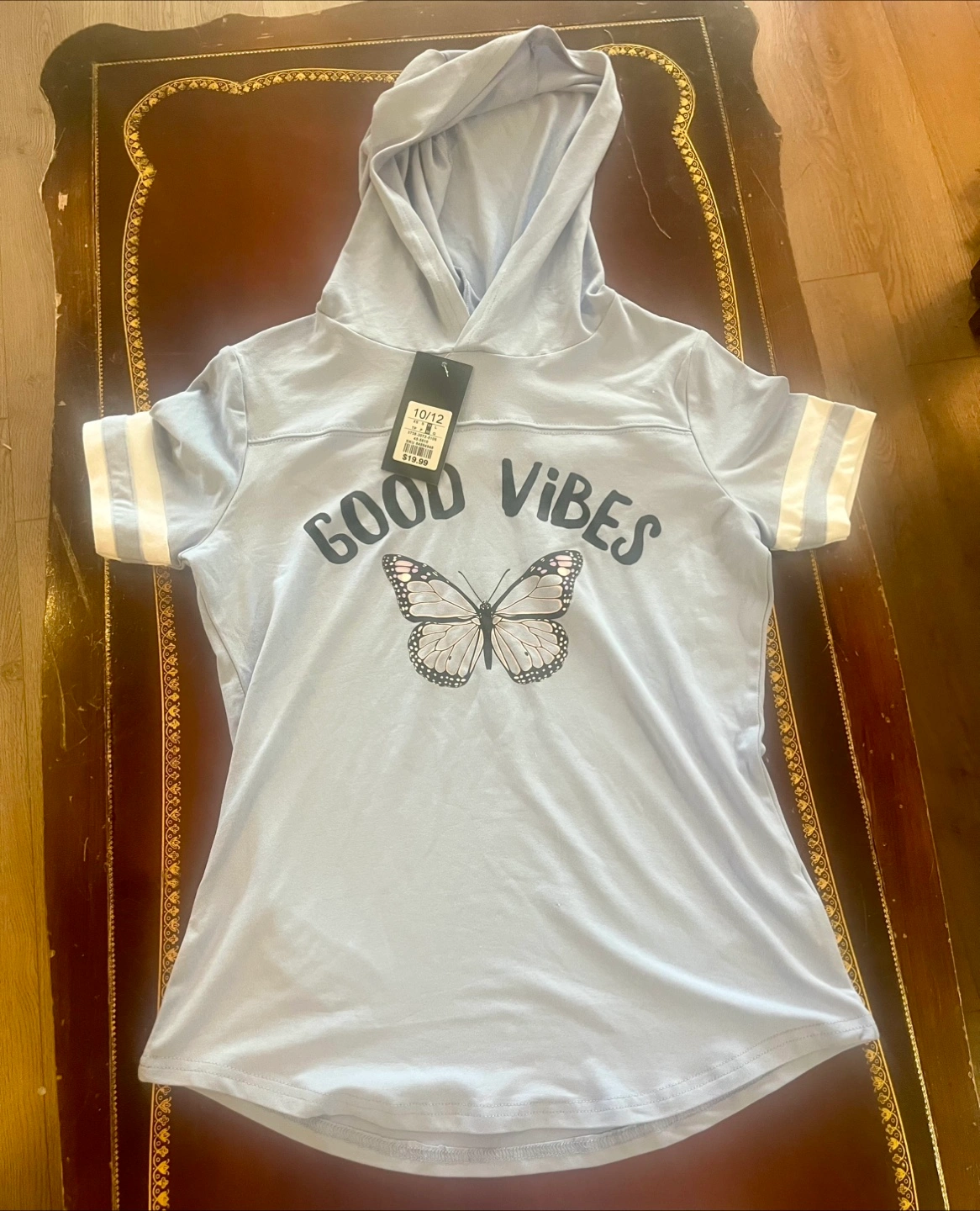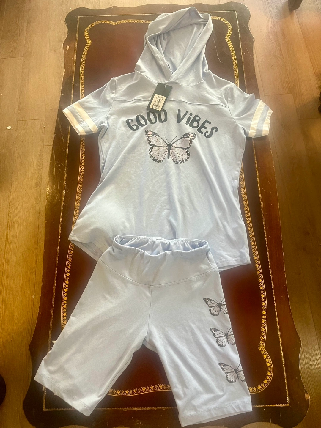Cute and comfy loungewear set! The top is a short-sleeved hoodie with a "Good Vibes" graphic and a butterfly. The shorts have a butterfly design on the leg. Size small, and originally bought for $19.99 plus tax!