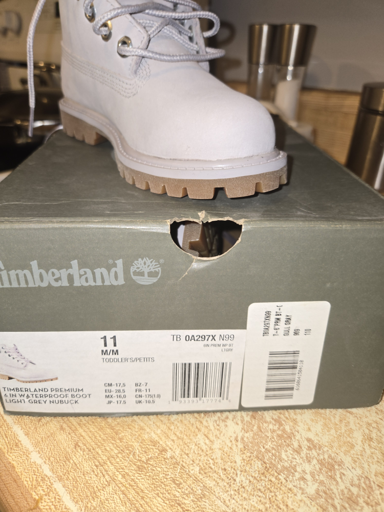 Selling a pair of Timberland Premium 6" Waterproof Boots for toddlers in size 11. They're a light grey nubuck colour and come with the original box. Perfect for keeping little feet dry and stylish! never worn brand new