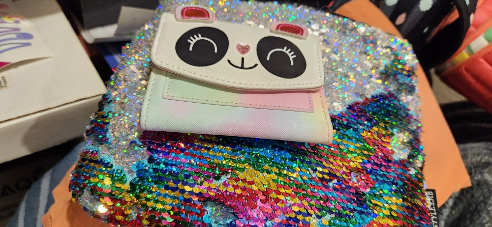 Cute sequin backpack from Style Lab, featuring vibrant colours. Also included is a panda-themed wallet, perfect for kids