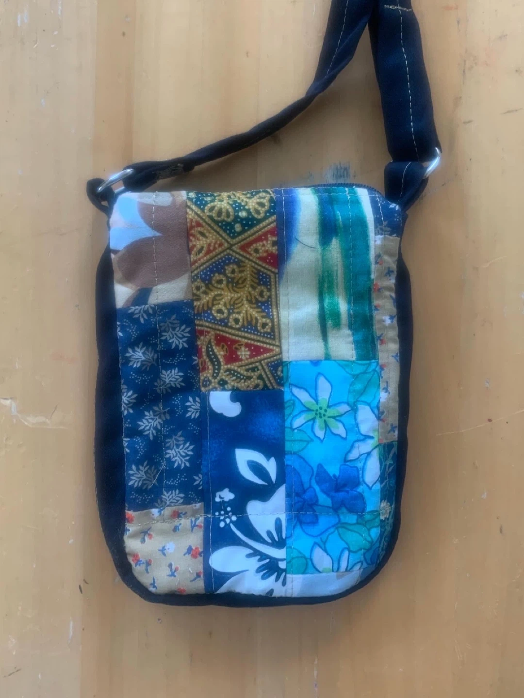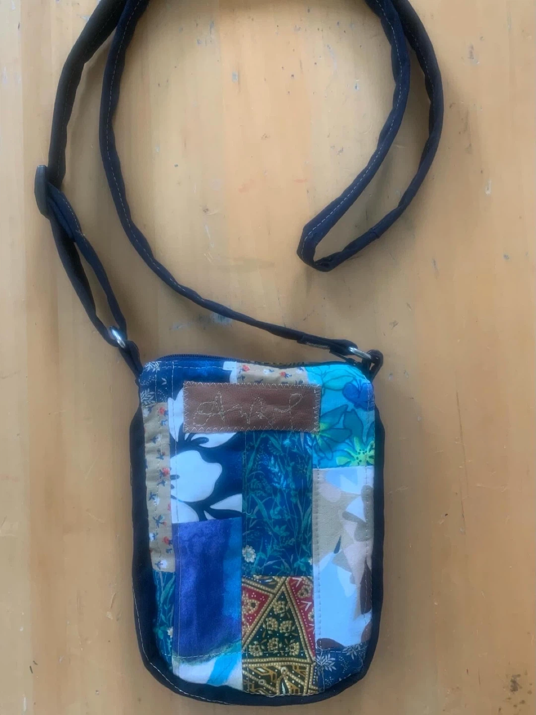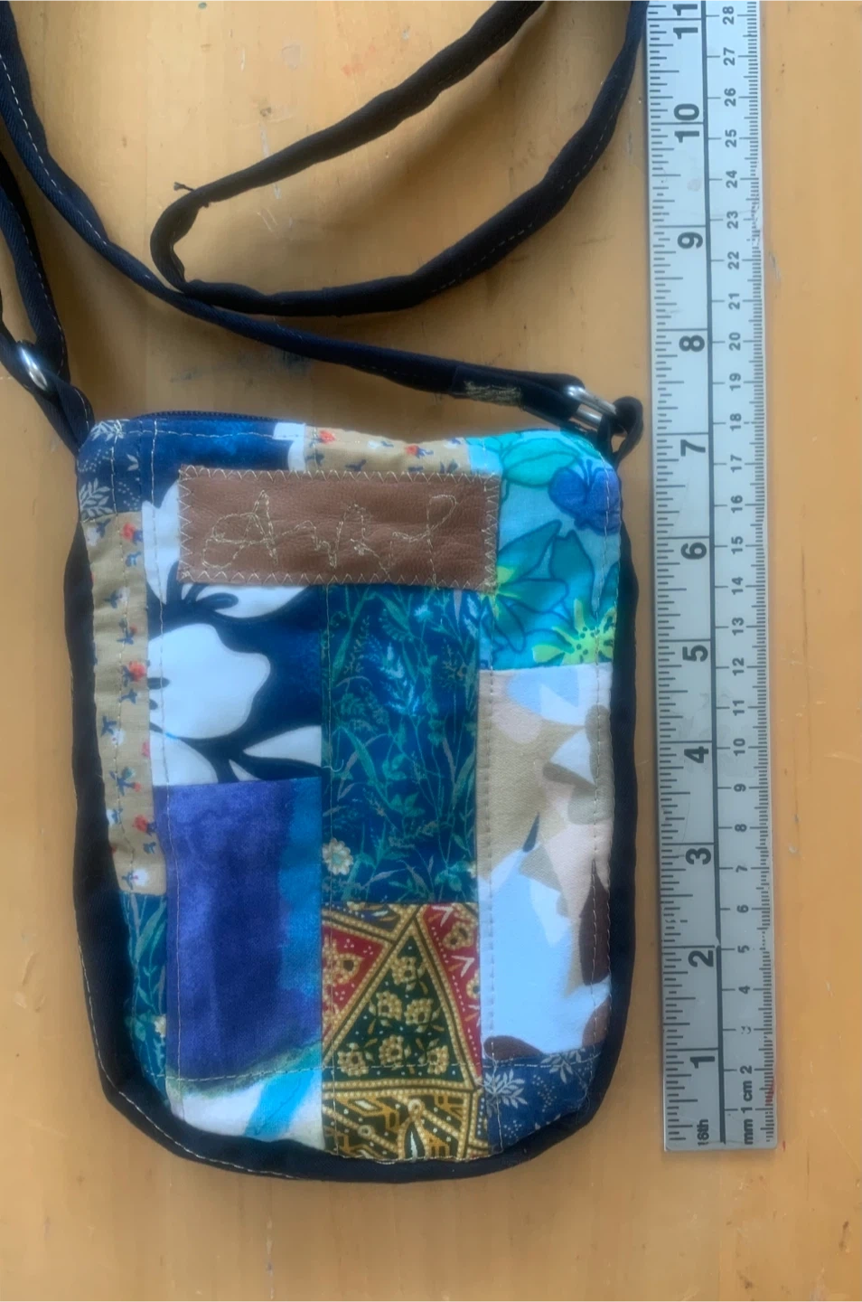 Unique handcrafted crossbody smartphone bag. It has 2 interior pockets. It features a beautiful patchwork design with various colours and patterns. The adjustable strap is long enough to wear comfortably across your body. Pick up at Eglinton ave east at Bayview.