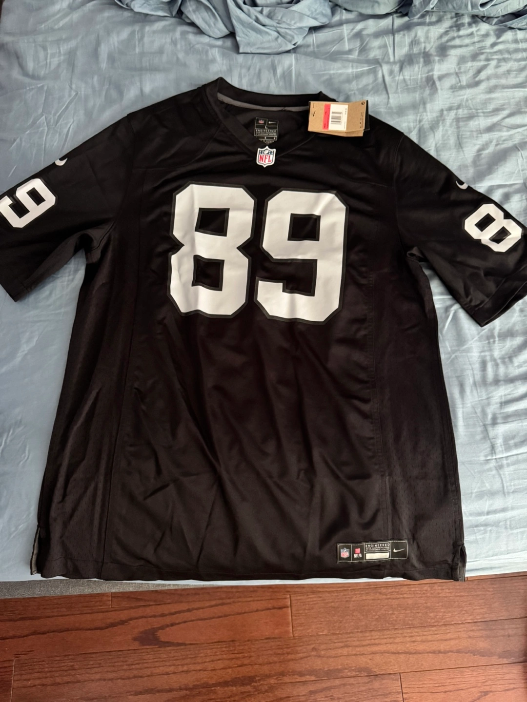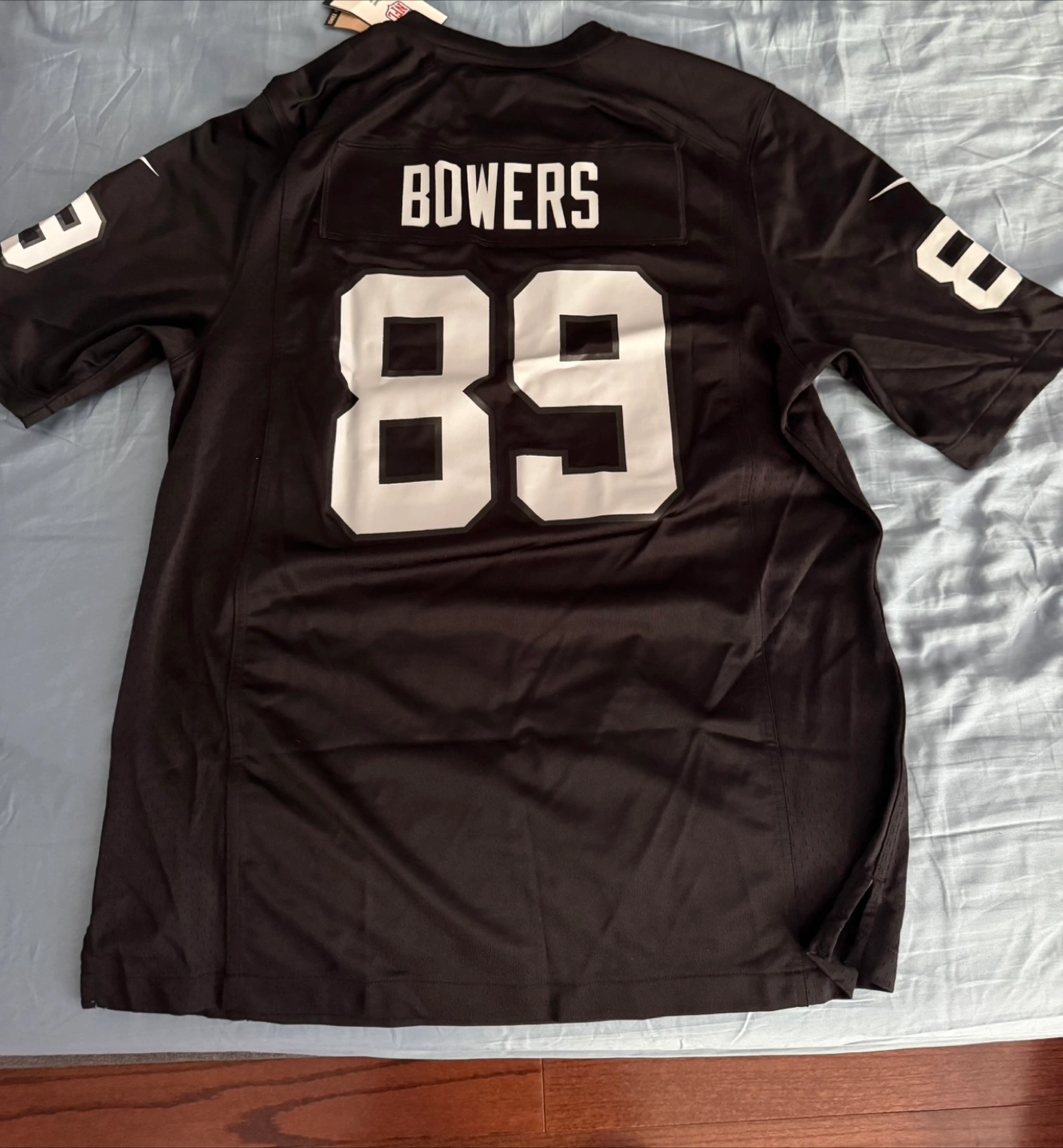 Selling a brand new with tags Nike NFL Las Vegas Raiders jersey, Bowers #89 in size Large. It's black. The suggested retail price was $130.00 plus tax. Perfect for any Raiders fan!