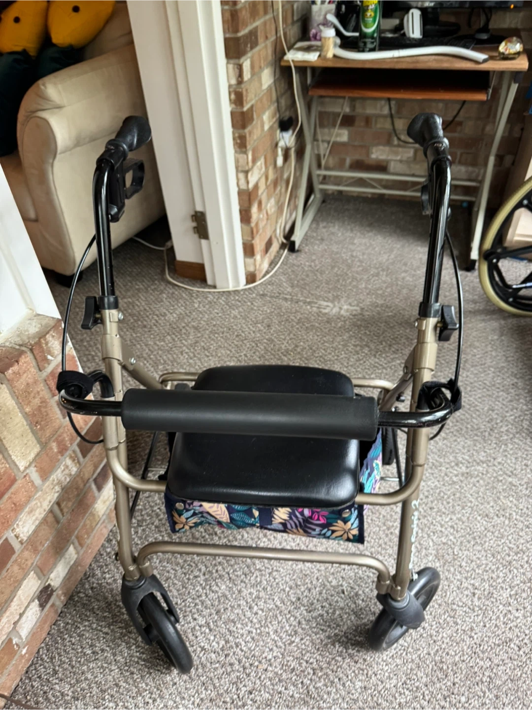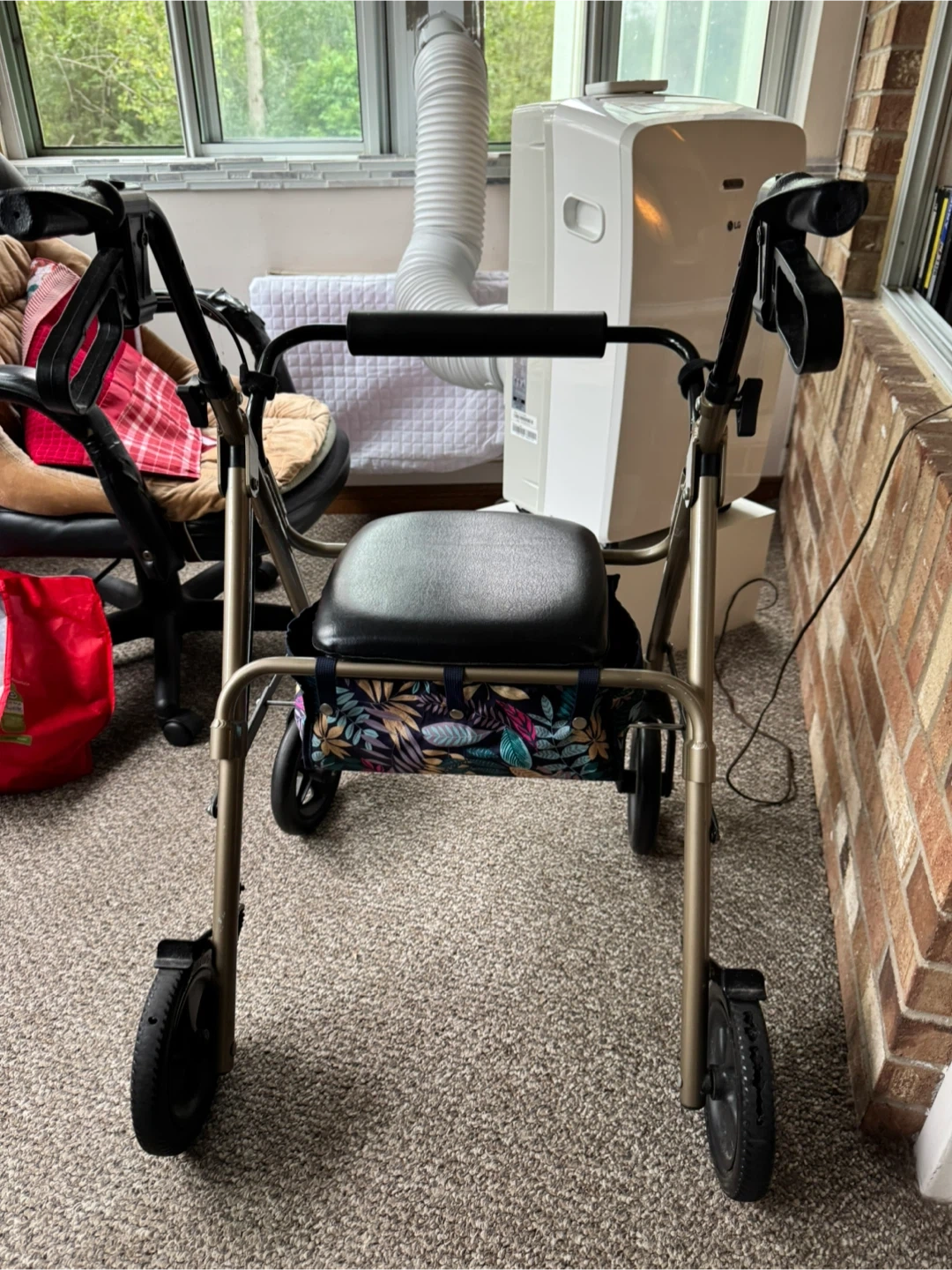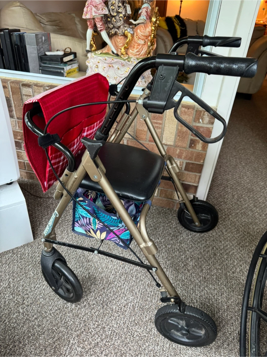 Selling a used four-wheel rolling walker with a built-in seat. It's in good condition and ready to assist someone who needs a little extra support while walking. Great for indoor or outdoor use! 2 tires getting worn and could be easily replaced. Comes with bag to store items under the seat.