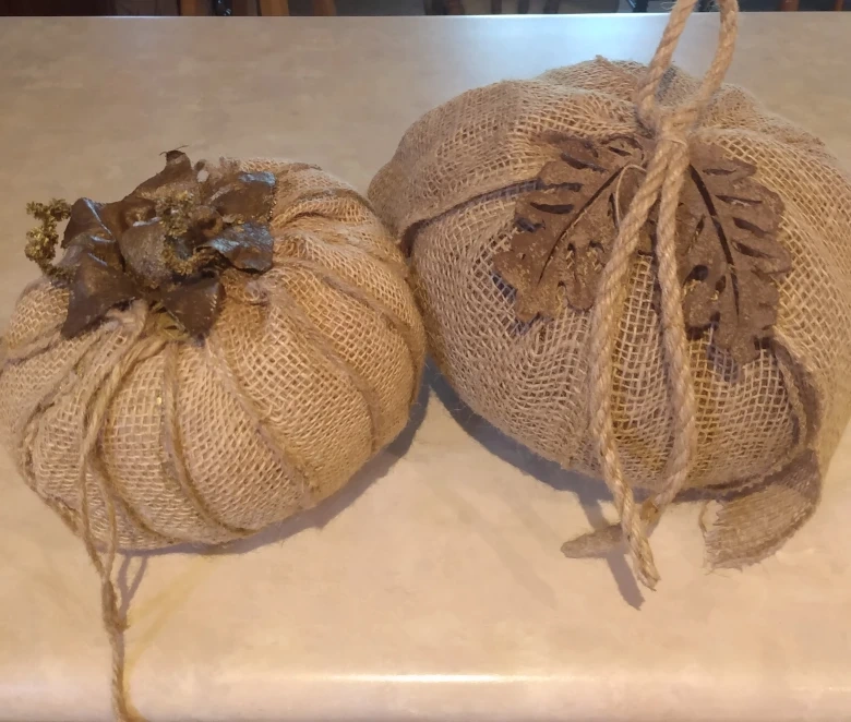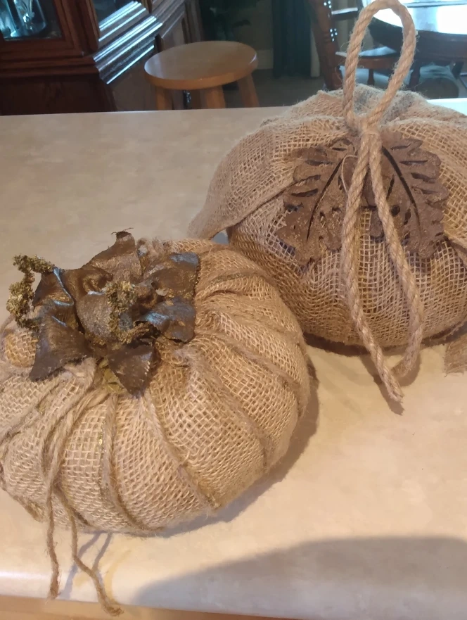 These burlap pumpkins are perfect for fall decorating! They add a rustic, cozy touch to any space. The larger one has a leaf detail and the smaller one has some gold leaves on top. They're in great condition and ready to bring some autumn charm to your home( Cash pick up)