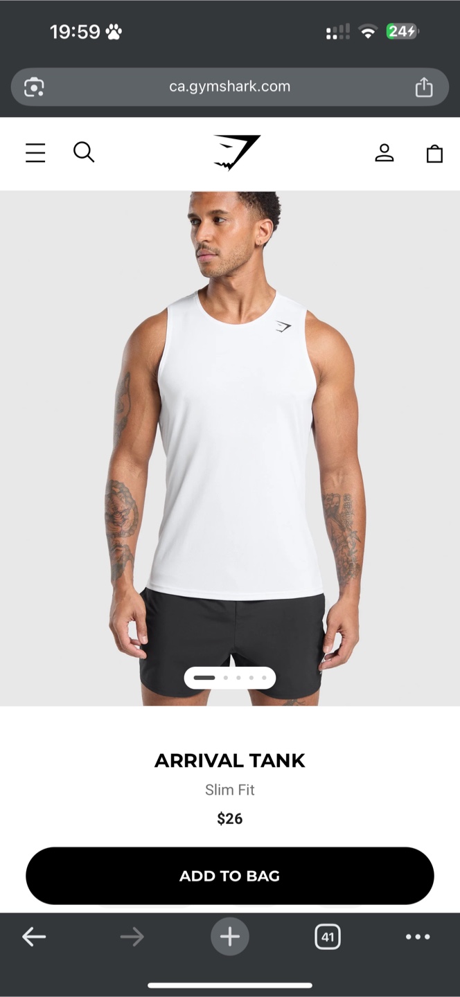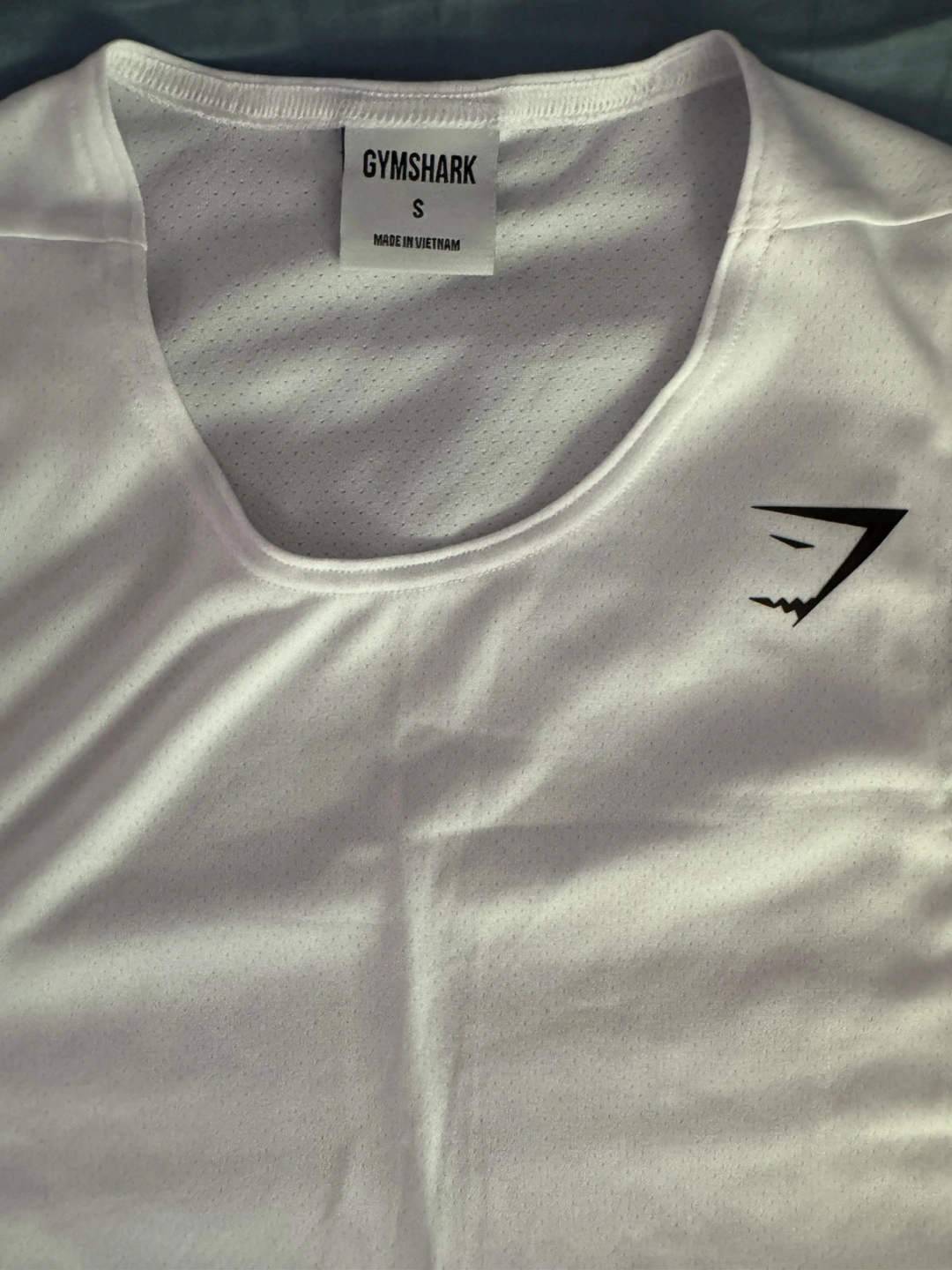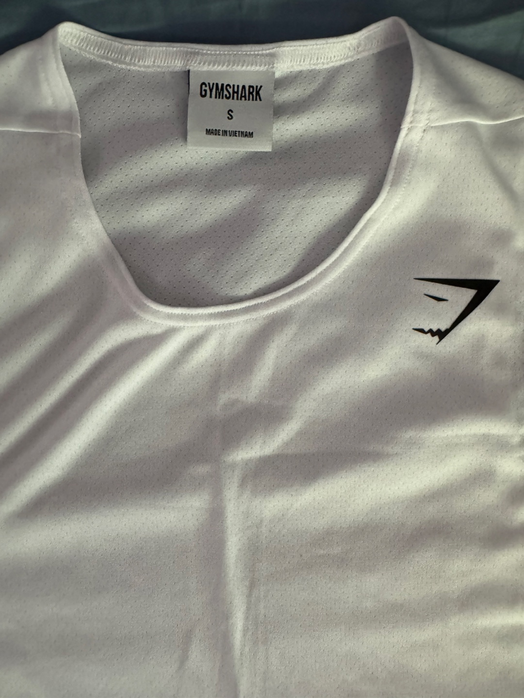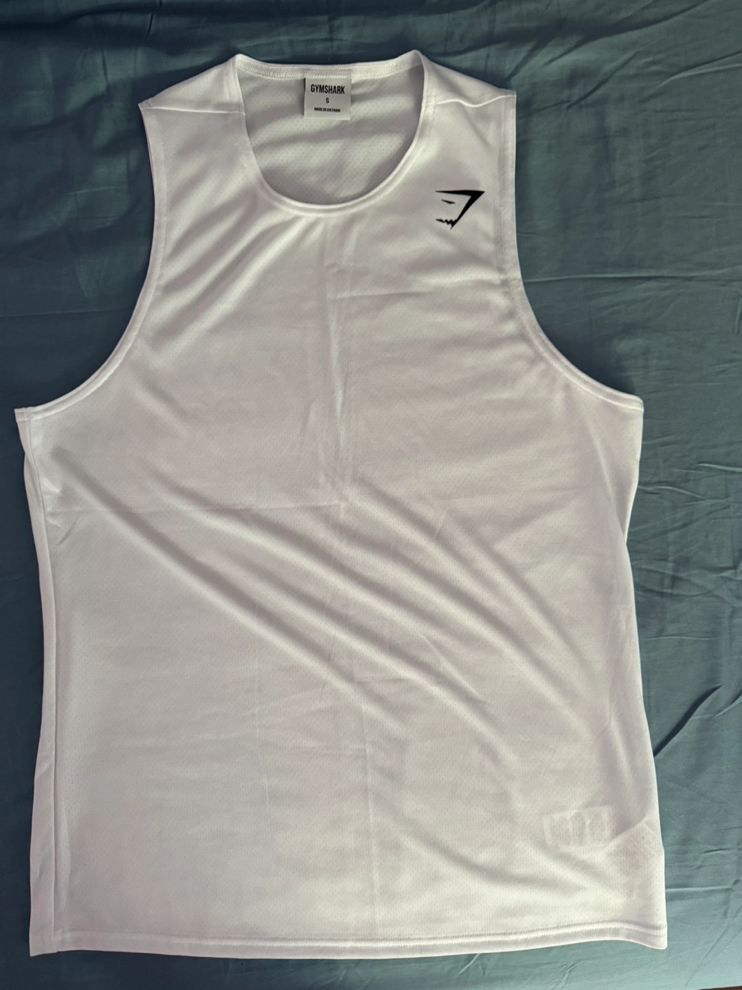 Selling a new Gymshark tank top in white. It's a size small and features the Gymshark logo. Perfect for workouts or casual wear!