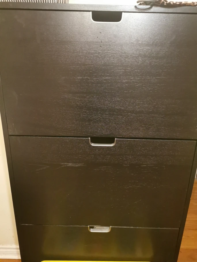 4 drawers, Selling a shoe cabinet in black/brown colour. It's in good condition and can hold multiple pairs of shoes. Back is empty. Perfect for keeping your entryway organized!
