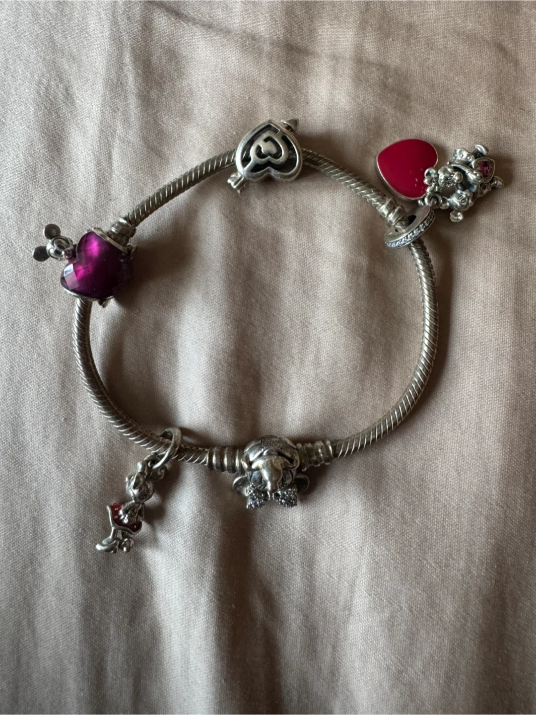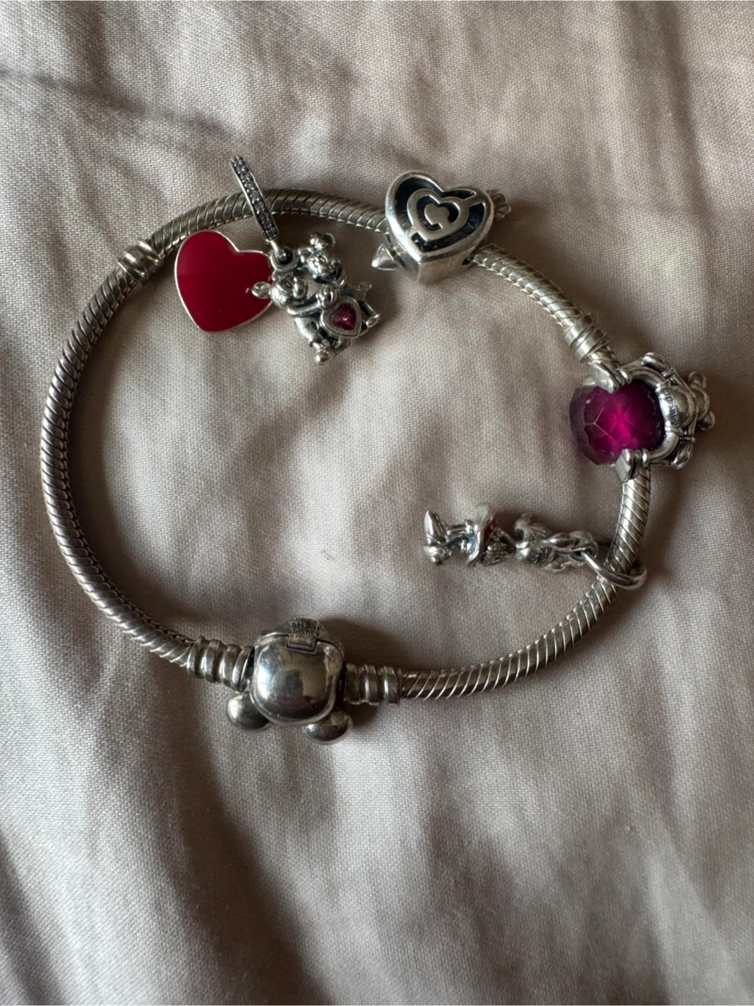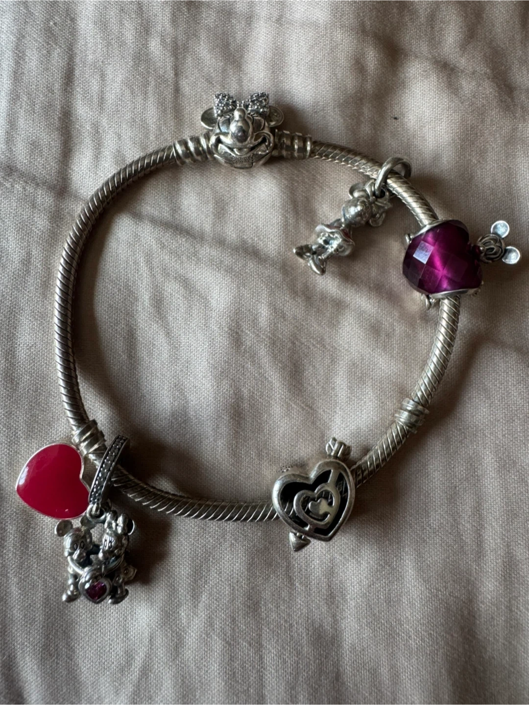 Selling a lovely Pandora charm bracelet! It comes with a variety of Disney charms, including Mickey and Minnie Mouse, and heart-shaped charms. Perfect for any Disney lover or Pandora collector