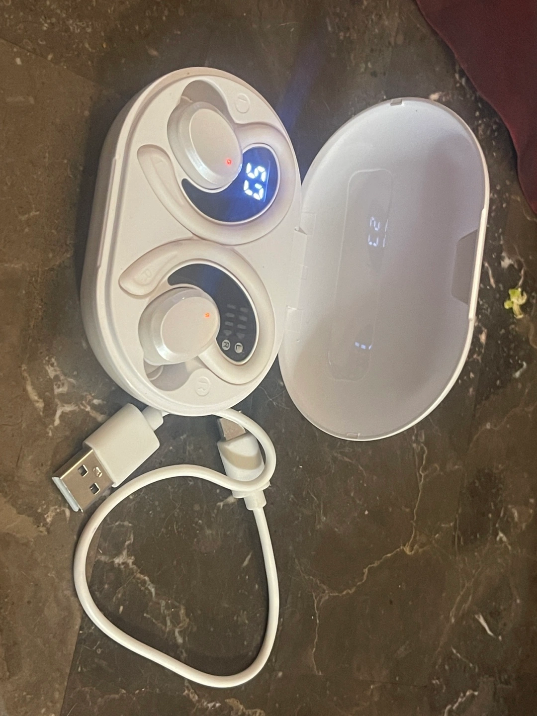 Selling a pair of white wireless earbuds! They come with their charging case and a USB cable. The case displays the charge level for each earbud, so you always know how much juice you've got left. Great for listening to your favourite tunes on the go!