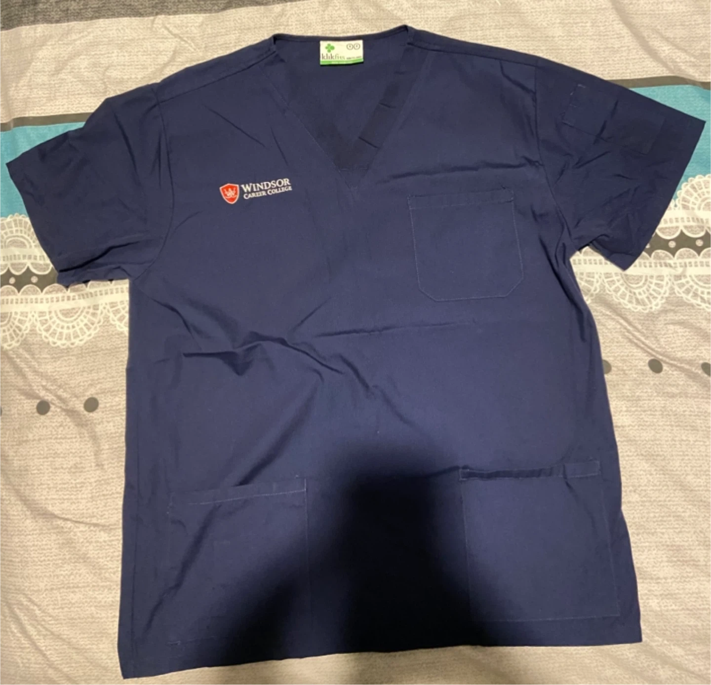 Selling a navy blue scrub set from Windsor Career College. The set includes both the top and the pants. It's in great condition and ready for a new owner!