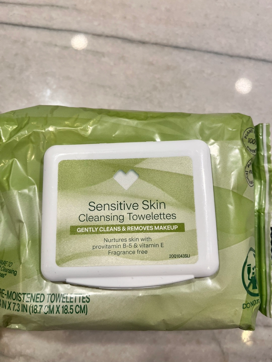 - Sensitive Skin Cleansing Towelettes - gently cleans and removes makeup, nurtures skin with provitamin B-5 & vitamin E, fragrance-free