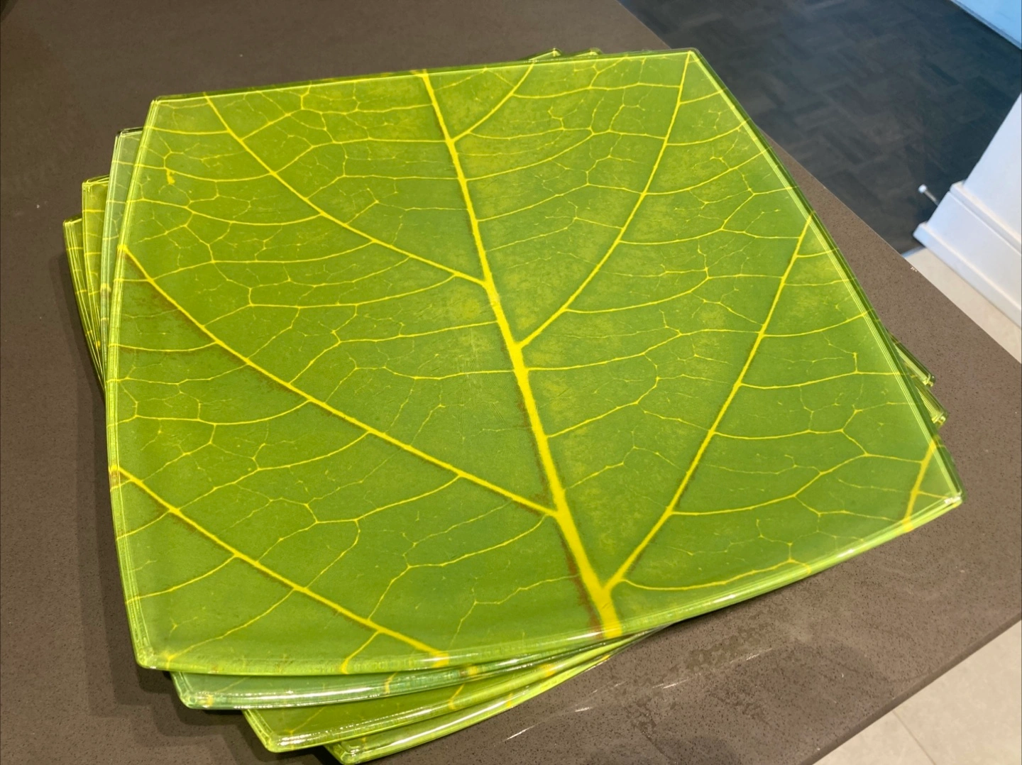 Selling a set of glass plates with a green leaf design. They're perfect for adding a touch of nature to your dining table. They are in great condition and ready for a new home