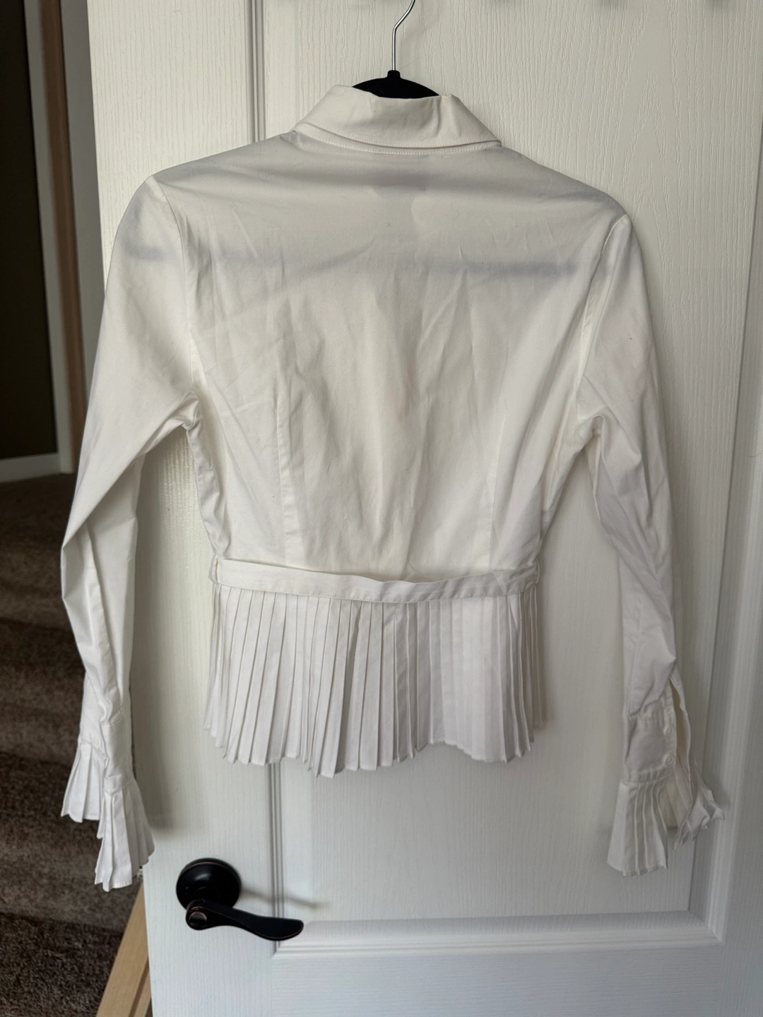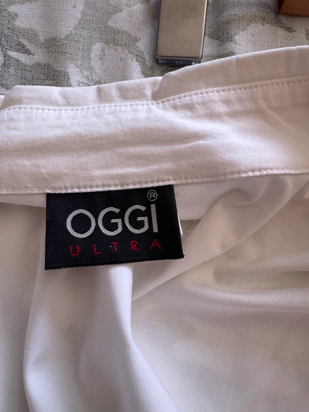 Selling a stylish white blouse from OGGI Ultra! It features a unique design with pleated details and a tie at the waist. Perfect for adding a touch of elegance to your wardrobe