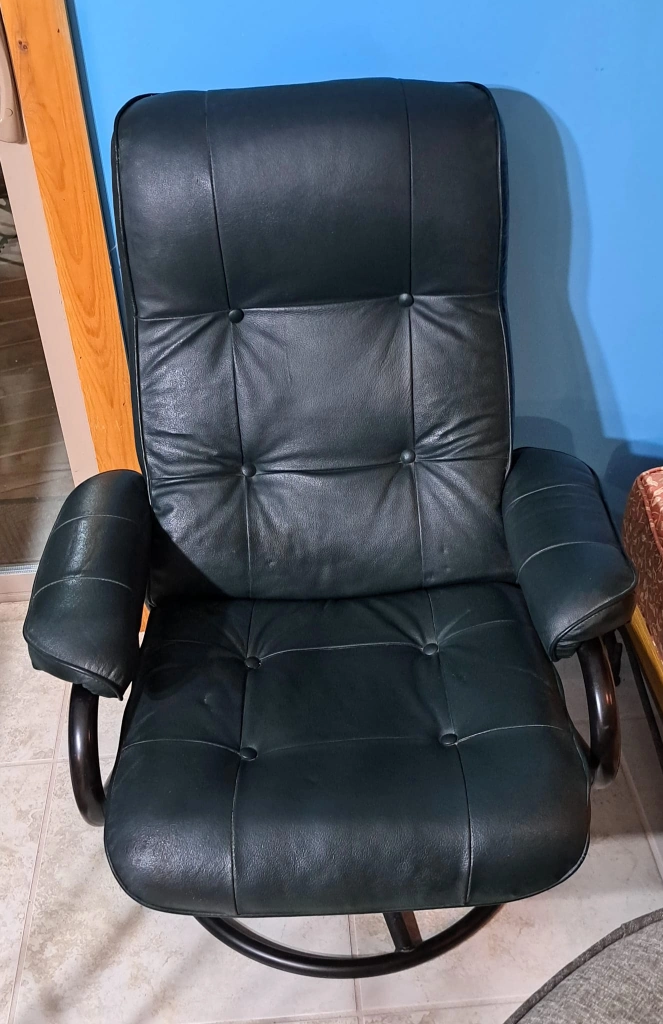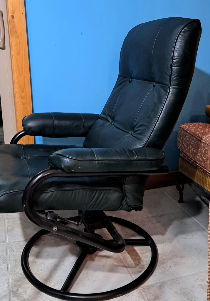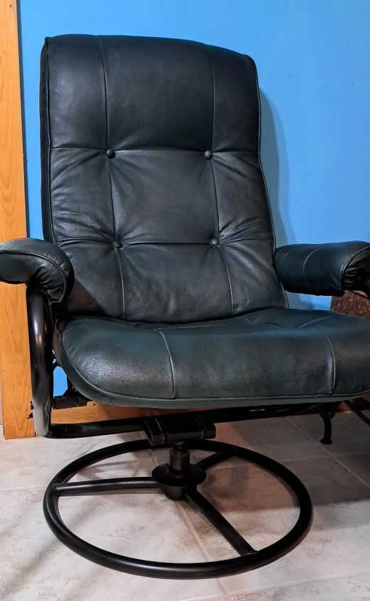 20Selling a comfortable leather swivel recliner chair. It's in good condition and would be a great addition to any living room or office. The chair is black and features a swivel base for easy movement.