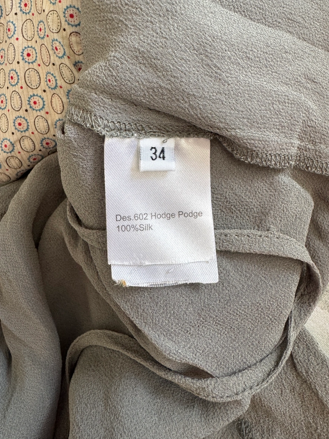 Selling a lovely olive green dress made from 100% silk. It features a unique design with a colourful central panel. The dress is a size 34 and is in great condition. Perfect for a special occasion or a stylish everyday look!