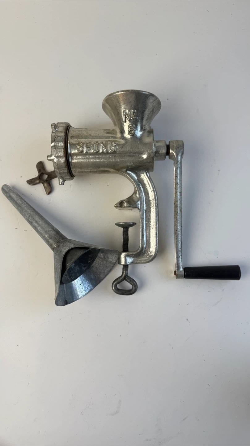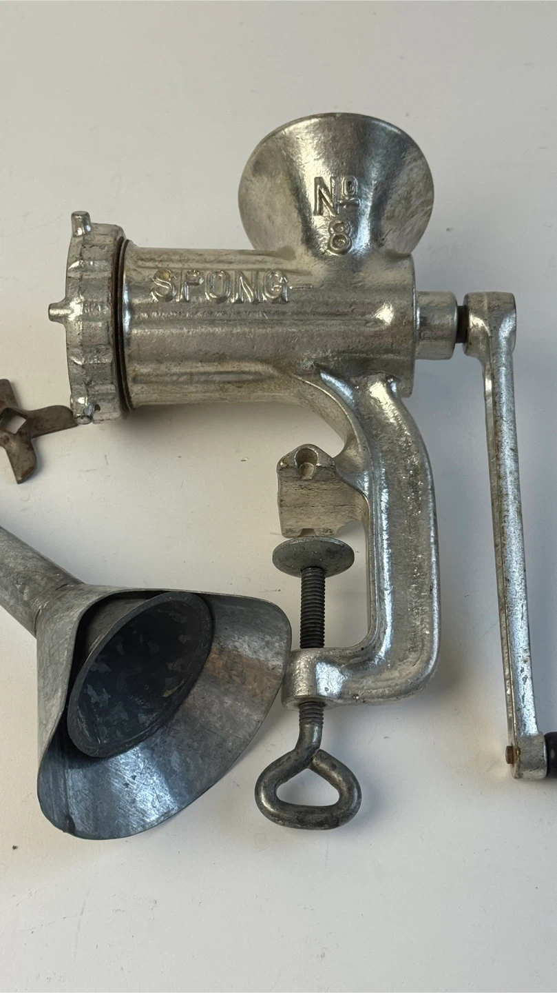 Selling a vintage Spong No. 8 meat grinder! It's a classic piece with a clamp for easy attachment to your countertop or table. Perfect for making homemade sausages or grinding your own meat for burgers. A great addition to any kitchen!